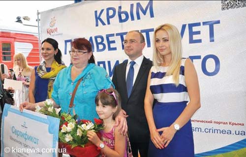 Кримчани з оркестром, кв╕тами ╕ подарунками в╕тали м╕льйонного туриста на зал╕зничному вокзал╕ у С╕мферопол╕. Ним виявилася с╕м’я — харк╕в’янка Майя Цепкова, а також ╖╖ донька Св╕тлана Льов╕на з внучкою В╕ктор╕╓ю Род╕оновою, яка прибула по╖здом Харк╕в-С╕мферополь ╕ добиралася в Крим через Харк╕в з Москви. Про це переда╓ кореспондент Укр╕нформу. «Так нас ще н╕коли не зустр╕чали в Криму. Останн╕ к╕лька рок╕в ми при╖жджа╓мо сюди практично щороку ╕ в╕дпочива╓мо по 2-3 тижн╕. Цього разу ми замовили тур у Демердж╕ п╕д Алуштою», — розпов╕ла С. Льов╕на. За ╖╖ словами, в Криму вони планують по╖здити з екскурс╕ями ╕сторичними м╕сцями, «але найголовн╕ше, через що ми тут, – це море». С. Льов╕на з╕зналася, що честь бути юв╕лейними туристами, яка випала ╖м, – при╓мна неспод╕ванка. Подарунком м╕льйонному туристу став тиждень оздоровлення на двох у розташованому на берез╕ л╕кувального озера санаторному комплекс╕ «Саки», а також страховий сертиф╕кат в╕д нещасного випадку на суму 1 млн. грн. на весь пер╕од перебування в Криму. За словами м╕н╕стра курорт╕в ╕ туризму АРК Олександра Л╕╓ва, цього року м╕льйонний турист прибув до Криму на в╕с╕м дн╕в ран╕ше, н╕ж тор╕к. «Символ╕чна зустр╕ч м╕льйонного туриста — це ╕м╕джевий для Криму зах╕д, який св╕дчить про туристичну та ╕нвестиц╕йну приваблив╕сть автоном╕╖», — зазначив Л╕╓в. В╕н п╕дкреслив, що тор╕к под╕бний зах╕д проводився в аеропорту, ╕ в найближчих планах м╕н╕стерства – в╕тати тих турист╕в, як╕ добираються у Крим морем ╕ автотранспортом. Як зазначив глава М╕нкурорт╕в, на сьогодн╕шн╕й день в Крим при╖хало турист╕в на 19% б╕льше, н╕ж у червн╕ минулого року, ╕ на 56% б╕льше, н╕ж р╕вно 4 роки тому – 2009 року. «Минулого року Крим прийняв понад 6 млн. турист╕в, а може прийняти до 8-10 млн. Головне, щоб зростання к╕лькост╕ в╕дпочиваючих в╕дбувалося не лише за рахунок л╕тнього пер╕оду, а за рахунок розширення кордон╕в курортного сезону – це сьогодн╕ наше основне завдання», — п╕дкреслив О. Л╕╓в.