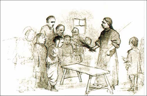 Науку починали звичайно з «Аз, буки, вед╕, глаголь» ╕, вивчивши азбуку, починали складати слова. «Поскладавши було «тлю-тля», — розпов╕дав мен╕ Тарас, — вийду я з школи на вулицю, гляну на яр, а там мо╖ щаслив╕ ровесники грають соб╕ на солом╕ б╕ля клун╕, не знаючи, що ╓ на св╕т╕ ╕ дяк, ╕ школа. Дивлюся, було, я на них та й думаю: чому я такий безталанний, нащо мене сердешного мордують над букварем отим клятим? Махну рукою та драла через цвинтар в яр до отих щасливих ровесник╕в в теплу солому ╕ т╕льки що почну барахтатись, аж ось ╕дуть два «псалтирники»; беруть мене п╕д плеч╕, ведуть в школу, а в школ╕... сам╕ зна╓те, що чинять школярам за ут╕кання» (Див.: Спогади про Тараса Шевченка. – К., 1982. – С. 26-27).
