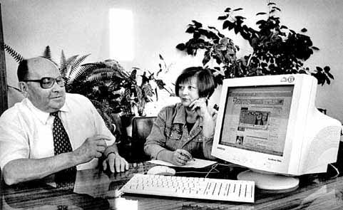 Головний редактор газети "Волинь" Степан Сачук і член редколегії, редактор відділу інформації Катерина Зубчук біля комп`ютера з "волинською душею"