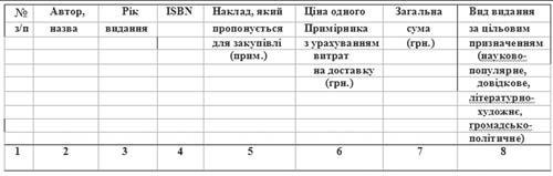 М╤Н╤СТЕРСТВО КУЛЬТУРИ УКРА╥НИ РОЗПОЧИНА╢ ПРИЙОМ ПРОПОЗИЦ╤Й В╤Д СУБ’╢КТ╤В ВИДАВНИЧО╥ СПРАВИ ЩОДО В╤ДБОРУ УКРА╥НОМОВНИХ КНИГ ДЛЯ ПОПОВНЕННЯ ФОНД╤В ПУБЛ╤ЧНИХ Б╤БЛ╤ОТЕК До розгляду приймаються пропозиц╕╖ щодо в╕дбору книг (у тому числ╕ для д╕тей та юнацтва), виданих протягом 2011–2013 рок╕в, ╕ як╕ за ц╕льовим призначенням належать до науково-популярних, дов╕дкових, л╕тературно-художн╕х чи громадсько-пол╕тичних. Пропозиц╕╖ приймаються в╕д суб’╓кт╕в видавничо╖ справи, внесених до Державного ре╓стру видавц╕в, вигот╕вник╕в ╕ розповсюджувач╕в видавничо╖ продукц╕╖ (дал╕ – Видавц╕). Видавц╕ до М╕н╕стерства культури Укра╖ни подають: – лист-подання на ╕м’я м╕н╕стра культури Укра╖ни, п╕дписаний повноважним представником; перел╕к укра╖номовних книг, що пропонуються для поповнення фонд╕в публ╕чних б╕бл╕отек, за формою, зг╕дно з додатком; – розрахунок ц╕ни пропозиц╕╖ (ц╕на повинна включати варт╕сть укра╖номовних книг та варт╕сть витрат на доставку укра╖номовних книг до Автономно╖ Республ╕ки Крим, обласних центр╕в, м╕ст Ки╓ва та Севастополя), засв╕дчений п╕дписом повноважного представника та печаткою Видавця; – по одному прим╕рнику кожно╖ укра╖номовно╖ книги, яка пропону╓ться для в╕дбору. Кр╕м цього, надаються зав╕рен╕ в установленому порядку коп╕╖: документ╕в, що п╕дтверджують наявн╕сть у Видавця виключних майнових прав ╕нтелектуально╖ власност╕ на твори, запропонован╕ для в╕дбору; – св╕доцтва про внесення суб’╓кта видавничо╖ справи до Державного ре╓стру видавц╕в, вигот╕вник╕в ╕ розповсюджувач╕в видавничо╖ продукц╕╖; статуту Видавця – юридично╖ особи; – документ╕в, що п╕дтверджують повноваження представника Видавця. Пропозиц╕╖ подаються Видавцями особисто або поштою ╕з 1 по 14 серпня (включно) 2013 року. Просимо звернути увагу, що до розгляду не приймаються пропозиц╕╖ щодо в╕дбору книг, як╕ буди видан╕ за рахунок кошт╕в державного або м╕сцевого бюджет╕в. Також, пропозиц╕╖ подан╕ з порушенням встановлених строк╕в та вимог, не розглядаються. Поштова адреса: 01601, м. Ки╖в, вул. ╤вана Франка, 19, М╕н╕стерство культури Укра╖ни Прийом документ╕в зд╕йсню╓ начальник в╕дд╕лу анал╕зу та прогнозування д╕яльност╕ б╕бл╕отек управл╕ння стратег╕чного планування культурного розвитку та рег╕онально╖ пол╕тики у сфер╕ культури Департаменту формування державно╖ пол╕тики у сфер╕ культури, мистецтв та осв╕ти Лариса Степан╕вна Н╕к╕форенко. Конт. телефон: (044) 234-15-61.