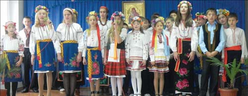 До цього заходу готувалася вся школа: прим╕ряли костюми, вивчалися п╕сн╕, думали, як краще ╖х ╕нсценувати. Свято розпочалося. Просимо Божо╖ допомоги через молитву (ми ж бо православна школа). Звучать слова, що ╖х декламу╓ вчителька укра╖нсько╖ мови та л╕тератури Людмила Леонт╕╖вна Смоляр: