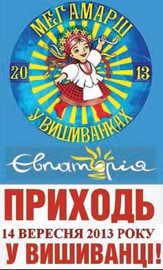 Запрошуються не лише укра╖нц╕, а й представники ус╕х народ╕в, що мешкають в Криму! Зб╕р учасник╕в маршу (в нац╕ональному укра╖нському вбранн╕!), присвяченого 200-р╕ччю Т. Г. Шевченка, в суботу, 14 вересня, о 10.00 на Театральн╕й площ╕ м. ╢впатор╕я. В програм╕ — виступи творчих колектив╕в, народн╕ сп╕ви ╕ танц╕, поетичн╕ читання, конкурс на кращу вишиванку та ╕н. Детальн╕ше — http://vk.com/topic-55078120_28542352