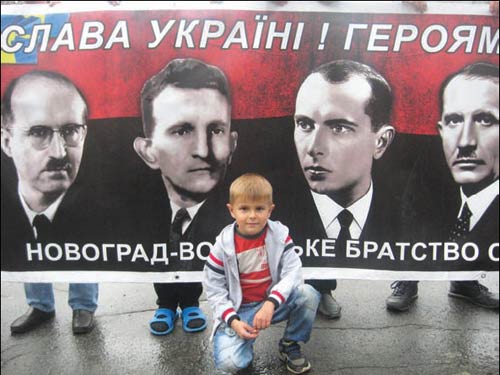 З думкою Руслана Загривого я погоджуюся. На Полтавщину не можуть не впливати зрос╕йщен╕ Харк╕вщина ╕ Донеччина. Хоч Новоград-Волинський в╕дноситься до т╕╓╖ ж «петлюр╕всько╖» Укра╖ни, що й Полтава, але на нього Харк╕вщина вже не вплива╓. А вплива╓ «бандер╕вська» Р╕вненщина, та й до Галичини зв╕дси недалеко. Мовн╕ стандарти, якщо й не однаков╕, то близьк╕. Як я вже зауважив, рос╕йськомовних вив╕сок у м╕ст╕ майже нема╓. Але щось тут не да╓ почуватися так, як у Львов╕. Пот╕м зрозум╕в, що тут у в╕зуальн╕й реклам╕ ╓ не так вже й мало рос╕йських сл╕в, як╕ м’яко вписуються в укра╖нськ╕ тексти. Скаж╕мо, магазини «Карапуз» ╕ «Малютка», дитячий розважальний центр «Непоседа», бар «Сан Санич» тощо. Колись я ╕ в Черн╕вцях звернув увагу на кафе з негалицькою назвою «У Петровича». Тод╕ подумав, що нав╕ть «бандер╕вська» Укра╖на ╓ неоднор╕дною. В Галичин╕ р╕дко називають людину по батьков╕. Х╕ба що викладач╕в у школах. Зазвичай галичанин — це «пан Орест», «пан Ярослав», «пан╕ Оксана»... А ось на Буковин╕ вже, бачите, ╓ «Петрович», у Новоград-Волинському — «Сан Санич». Нав╕ть л╕дера Братства В╕ктора Бусленка побратими шанобливо називають не ╕накше, як «Тарасович». Що ж, ми р╕зн╕... Проте ╓ сп╕льний знаменник — геро╖чна ╕стор╕я Укра╖ни. Нагадаю, що на територ╕╖ Житомирщини також д╕яла УПА. Останн╕й б╕й в╕дбувся в сел╕ Сушки Коростиш╕вського району в липн╕ 1955-го року. Т╕льки в липн╕ 1955 року об╕рвалося життя сотенного «Романа» (В. Кудр╕) та б╕йця «Лиса» (О. Усача). А до цього ж тривала боротьба! В╕д села Сушки й до Ки╖вщини зовс╕м недалеко. Так що для укра╖нц╕в сутт╓во╖ р╕зниц╕ нема╓ — в г╕рських л╕сах Карпат воювати чи на житомирському Пол╕сс╕. Коли п╕сля зустр╕ч╕ хлопц╕ з горд╕стю розгорнули банер ╕з зображенням Степана Бандери, Романа Шухевича, ╢вгена Коновальця та ╕нших борц╕в за Укра╖ну, я побачив, що б╕ля нас крутиться маленький жвавий хлопчик В╕ктор Коцюба. Ну, думаю, це ж наймолодший член Братства! Про всяк випадок роблю ╕ його фото, небезп╕дставно вважаючи, що ця мить ╓ ╕сторичною. Як п╕де процес дал╕ — накри╓ Укра╖ну хвиля русиф╕кац╕╖ чи висто╖мо? Чи буде у В╕ктора сво╓ мовне середовище? Найкраще, звичайно, якби «сво╖м» був увесь Новоград-Волинський... З цього приводу Володимир Л╕берда, актив╕ст Братства ╕ студент промислово-економ╕чного техн╕куму, висловився так: