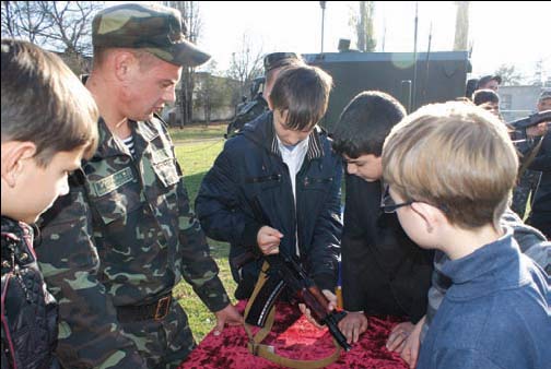 5 листопада двер╕ загону рад╕оелектронно╖ боротьби Центру оперативного (бойового) забезпечення нац╕онального в╕йськового флоту гостинно в╕дчинилися для учн╕в одн╕╓╖ з с╕мферопольських шк╕л. Тридцять п╕дл╕тк╕в на чол╕ з класним кер╕вником Галиною В’язовик вперше зав╕тали у гост╕ до в╕йськових моряк╕в. РЕБ╕вц╕ влаштували сво╖м гостям справжн╕й ╕нформац╕йний драйв, коли за в╕дносно короткий пром╕жок часу школяр╕ побачили безл╕ч елемент╕в повсякденно╖ житт╓д╕яльност╕ в╕йськового колективу. Тут були й заняття з захисту в╕д збро╖ масового ураження, за переб╕гом яких учн╕ не т╕льки спостер╕гали, а й взяли у них активну участь, прим╕ряючи на себе загальнов╕йськовий захисний комплект та протигаз. Затамувавши подих, п╕дл╕тки спостер╕гали за вправними д╕ями в╕йськових моряк╕в п╕д час занять з╕ стройово╖ та ф╕зично╖ п╕дготовок. А на тактичному пол╕ частини уваз╕ гостей були представлен╕ основн╕ зразки в╕йськово╖ техн╕ки, що перебува╓ на озбро╓нн╕ у загон╕. Хлопц╕в неможливо було в╕двол╕кти в╕д апаратних станц╕й перешкод пов╕тряних ц╕лей та високоточно╖ збро╖, вони уважно розглядали обладнання станц╕╖ рад╕оконтролю та розв╕дки, ╕ нав╕ть виконували певний алгоритм д╕й за операторським пультом. Враження у гостей були надзвичайн╕. Ще б пак, така ун╕кальна можлив╕сть в╕дчути себе у рол╕ оператора потужно╖ бойово╖ техн╕ки, вслухаючись через навушники у хаос звук╕в, що несе рад╕оеф╕р та впливати на нього. Згодом д╕╓в╕сть роботи малогабаритних передавач╕в перешкод ус╕ присутн╕ мали можлив╕сть перев╕рити на власних гаджетах, оск╕льки п╕сля запуску ц╕╓╖ апаратури у вс╕х присутн╕х «зник» моб╕льний зв’язок. За словами заступника командира загону з роботи ╕з особовим складом кап╕тана Олександра Морозовського, який проводив екскурс╕ю для школяр╕в, саме ц╕ станц╕╖ забезпечували безпеку проведення футбольних змагань в ход╕ ╢вро-2012 на стад╕он╕ «Донбас-арена» у Донецьку. Також дванадцятир╕чн╕ хлопц╕ та д╕вчата побували у клас╕ п╕дготовки оператор╕в та спробували сво╖ сили п╕д час виконання норматив╕в з╕ збирання-розбирання автомата АК-74. Командир загону майор Юр╕й Савченко переконаний в д╕╓вост╕ таких заход╕в, адже свого часу, у десятир╕чному в╕ц╕, в╕н вперше побував у в╕йськовому п╕дрозд╕л╕ ╕ саме тод╕ прийняв р╕шення пов’язати свою долю з в╕йськом. — Саме той в╕зит у гост╕ до в╕йськових в╕д╕грав вир╕шальну роль у мо╓му вибор╕ профес╕йного зростання, — говорить оф╕цер, припускаючись думки, що серед сьогодн╕шн╕х гостей частини стоять майбутн╕ в╕йськов╕. В ход╕ в╕двертого та неупередженого сп╕лкування моряки розпов╕дали учням про переваги в╕йськово╖ служби. На ╖хню думку, св╕дченням зростання поваги до профес╕╖ в╕йськового ╓ той факт, що на сьогодн╕ в частин╕ нема╓ жодного в╕йськовослужбовця строково╖ служби, а процент укомплектованост╕ п╕дрозд╕лу «контрактниками» перевищу╓ 90%. Наприк╕нц╕ екскурс╕╖ юн╕ в╕дв╕дувач╕ в╕дв╕дали матроський камбуз, де скуштували справжню арм╕йську кашу, та сповнен╕ незабутн╕х вражень дякували в╕йськовим морякам за гарно та зм╕стовно проведений час. Свою думку висловив учень 6-Б класу ЗОШ № 29 Андр╕й Буковський: «Сьогодн╕ я, побувавши в гостях у в╕йськових моряк╕в, вкотре переко