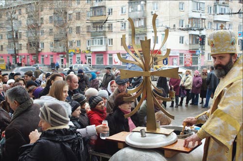 Арх╕╓пископ С╕мферопольський ╕ Кримський Климент УПЦ КП проводить обряд освячення води перед храмом святих Володимира та Ольги у С╕мферопол╕ на свято Водохреща 2013 року. ╤ цьогор╕ч прихожан чекають тут у нед╕лю, 19 с╕чня, з 9-╖ години ранку.