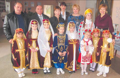 На фото (зл╕ва направо): депутат Судацько╖ м╕сько╖ ради Шевкет Умерович Мустафа╓в, заступник судацького м╕ського голови Ем╕рсал╕ Сеттарович Аблял╕мов, пом╕чник народного депутата ВР Укра╖ни Б. Д. Дейча Св╕тлана Микола╖вна Шабельникова, директор Груш╕всько╖ ЗОШ Галина Степан╕вна Мустафа╓ва, начальник в╕дд╕лу осв╕ти Судацько╖ м╕сько╖ ради Наталя Анатол╕╖вна Некрасова, заступник судацького м╕ського голови Марина Володимир╕вна Горбатюк з╕ школярами