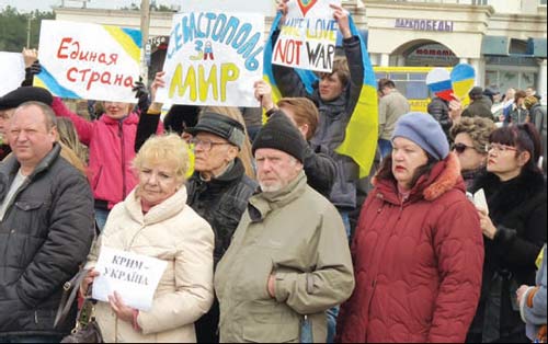 На юв╕лейному заход╕ б╕ля пам’ятника Тарасу Шевченку в Севастопол╕ 9 березня з╕бралося к╕лька сотень м╕стян з прапорами Укра╖ни, з плакатами проти рос╕йсько╖ агрес╕╖ та з гаслами: «Я проти в╕йни», «Я за в╕льну Укра╖ну», «Севастополь — за мир», «╢дина кра╖на», «Крим — Укра╖на». Громадський ╕ культурний д╕яч Олесь Дон╕й — один ╕з небагатьох народних депутат╕в Укра╖ни, який в╕дв╕дав Севастополь не один раз. Минулого року в╕н займався орган╕зац╕╓ю безкоштовних курс╕в укра╖нсько╖ мови. «╤ Севастополь, ╕ Крим реально окупован╕ рос╕йськими в╕йськами», — сказав в╕н учасникам м╕тингу ╕ з прикр╕стю пов╕домив, що ще минулого в╕вторка депутат╕в ВР просили н╕куди не ╖хати, а залишатись для вир╕шення орган╕зац╕йних питань. «Крим ╕ Севастополь мають бути нерозд╕льними з Укра╖ною, а ╕дея доброти ╕ ╕дея миру повинн╕ перемагати», — упевнений депутат. В╕н висловив категоричну незгоду ╕з так званим референдумом. Адм╕рал Юр╕й ╤ль╖н, колишн╕й командувач В╕йськово-Морських Сил Збройних Сил Укра╖ни (2012-2014), прив╕тав укра╖нц╕в ╕з юв╕ле╓м Шевченка та побажав терп╕ння у важких умовах. Пол╕тичний експерт, голова правл╕ння Ком╕тету виборц╕в Укра╖ни, громадський д╕яч Олександр Черненко упевнено висловив свою думку про те, що за 10 дн╕в неможливо орган╕зувати всю процедуру будь-якого референдуму, отже, в╕н заздалег╕дь буде визнаний м╕жнародною сп╕льнотою як нелег╕тимний. Скандуванням «В╕та╓мо!» зустр╕ли появу ведучо╖ «ТСН. Особливе» на канал╕ «1+1» Солом╕╖ В╕тв╕цько╖. Вона сказала, що журнал╕сти хочуть показувати стан речей як в╕н ╓, ╕ непри╓мно вражена в╕дключенням укра╖нських телеканал╕в у Криму. «Пишаюсь тим, що ви залиша╓тесь патр╕отами. Ми вас точно не залишимо», — завершила вона св╕й короткий виступ. Заступник м╕сцевого товариства «Просв╕та», досл╕дник ╕стор╕╖ Мирослав Мамчак розпов╕в про те, що Тарас Шевченко був моряком ╕ два роки свого заслання пров╕в на Аральському мор╕ як рисувальник ╕ картограф. ╤ це спор╕дню╓ його ╕з м╕стом морсько╖ слави Севастополем. На м╕тингу одноголосно була прийнята резолюц╕я, в як╕й вимагалось в╕д укра╖нсько╖ влади «р╕шуче протид╕яти сепаратизму ╕ в╕йськов╕й окупац╕╖ Криму, гарантувати конституц╕йний лад Укра╖ни та нашу безпеку м╕жнародними миротворчими силами». П╕д час заходу учасники к╕лька раз╕в виконували Г╕мн Укра╖ни, «Реве та стогне Дн╕пр широкий», хор виконав б╕льше десятка п╕сень на в╕рш╕ Т. Шевченка. Волонтери розповсюдили серед лояльних до Укра╖ни громадян газету «Слово Севастополя», присвячену юв╕лею Тараса Шевченка. Великого емоц╕йного заряду читанням цитат Кобзаря та сп╕вом його п╕сень додали й вчител╕. К╕лька з них не могли стримати сльози п╕д час зворушливих момент╕в з╕брання. В╕дв╕дали зах╕д ╕ наш╕ заклят╕ «брати» з рос╕йськими прапорами ╕ георг╕╖вськими стр╕чками, як╕ скандували: «Рос╕я! Рос╕я!». Спочатку м╕л╕ц╕я забезпечувала порядок, але в к╕нц╕ заходу «брати» таки розбили одну машину, спровокували дорожньо-транспортну пригоду ╕ жорстоко побили трьох людей б╕ля Гагар╕нсько╖ районно╖ адм╕н╕страц╕╖. В╕сьмох хлопц╕в забрали у в╕дд╕лок м╕л╕ц╕╖ ╕ згодом в╕дпустили. Особлива агрес╕я незваних гостей була спрямована на журнал╕ст╕в, яким п╕д загрозою псування техн╕ки заборо