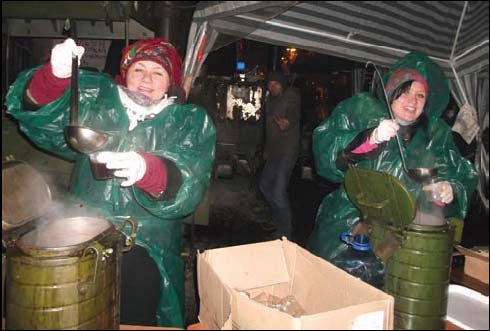 Коли потрапля╓ш в атмосферу Майдану, розум╕╓ш, як важливо триматися дружно, не в╕дступати, не падати духом. Розум╕╓ш, що дороги назад нема, ╕ що ми вже не будемо вчорашн╕, як би не повернулось колесо ╕стор╕╖... Майдан — це вся Укра╖на! Люди з м╕ст ╕ с╕л ус╕х рег╕он╕в нашо╖ держави тримаються вже б╕льше м╕сяця, щоб вибороти сво╖ законн╕ права на г╕дне життя. Хто день чи два, хто тиждень, а хто ╕ в╕д початку протесту сто╖ть на головн╕й площ╕ держави. Люди Майдану — незвичайн╕ люди! Вони зм╕нюють одне одного на варт╕, допомагають вистояти ╕ вижити, ╕ не втратити н╕ духовно╖, н╕ ф╕зично╖ сили. Це — дуже важко: б╕льшу частину доби на ногах, бо Майдан — не спить ╕ не розходиться. Майдан сто╖ть! Майдан живе! Майдан творить нову ╕стор╕ю Укра╖ни! У вс╕й ц╕й пол╕тично-громадсько-творч╕й атмосфер╕ боротьби ╓ стор╕нка польово╖ кухн╕. М╕сце гаряче й активне, нев╕д’╓мне в╕д життя майдан╕вц╕в. Пункт╕в харчування на Майдан╕ ╓ чимало. Там працюють сотн╕ добровольц╕в, ц╕лодобово забезпечуючи м╕тингувальник╕в ча╓м-кавою-канапками-гарячими стравами. Мен╕ пощастило дв╕ доби з одногодинними перервами на сон допомагати актив╕стам польово╖ кухн╕ № 15Х, що знаходиться на роз╕ будинку Профсп╕лок, вулиця Хрещатик, 18. Про тих людей, з якими довелось попрацювати ╕ посп╕лкуватись, маю честь, хоч коротко, але розпов╕сти загалу, бо кожен з них — ц╕кава особист╕сть! Звичайно, це буде крапля в океан╕, бо ск╕льки ╖х, вартих уваги, перейшло через цю кухню чи ╕нш╕ пункти харчування, але це — моя маленька данина кожному добровольцю на Майдан╕. На кухн╕ ╓ своя ялиночка, б╕ля яко╖ вс╕ фотографувались. Добровольцям — ╕ мен╕ в тому числ╕ — дають рукавиц╕, маску ╕ плащ — така соб╕ ун╕форма. Отже, як змогла я вияснити в гарячому процес╕ роботи кухн╕, м╕ж приготуванням-подаванням-прибиранням, саме ця — № 15Х запрацювала з ╕н╕ц╕ативи льв╕в’ян, як╕ ще в перш╕ майданн╕ дн╕ привезли в Ки╖в польову машину. Цей агрегат треба бачити! Величезна кухня на колесах, спец╕ально╖ конструкц╕╖, з н╕шами-баками, як╕ герметично закупорюються з вм╕стом т╕╓╖ страви, продукти на яку заклав шеф-кухар. Дим в╕дкритого вогню з п╕чки вудить все навколо, а висока температура жарин доводить страву до готовност╕. Зараз таких машин — дв╕, бо кияни до льв╕всько╖ доставили свою, ╕ вони працюють на повну силу, забезпечуючи майдан╕вц╕в смачними гарячими стравами — вдень ╕ вноч╕! Не знаю по╕менно, хто саме запустив цю кухню, але переконана, що то небайдуж╕ ╕ мудр╕ люди, як╕ знають, як важливо нагодувати людей гарячими стравами в такий екстремальний пер╕од. Про початок роботи ц╕╓╖ польово╖ кухн╕ мен╕ коротко розпов╕ла пан╕ Оксана — молода, симпатична, енерг╕йна киянка, яка не хот╕ла назвати свого пр╕звища. Сказала т╕льки, що ╓ сп╕ввласницею мереж╕ ресторан╕в у Ки╓в╕ ╕ що на Майдан╕ з перших дн╕в. Вм╕ло керуючи процесом, пан╕ Оксана п╕клу╓ться про доставку продукт╕в, про вчасне прибирання, про калор╕йн╕сть ╖ж╕, про..., про..., про...! ╤ разом з ус╕ма викону╓ будь-яку роботу, потр╕бну на даний момент. Ще один киянин, який вдень працю╓, а на н╕ч приходить на кухню ╕ ╓ тут н╕чним ╕нструктором, це — Роман, який також пр╕звище не назвав. Хлопець дуже серйозний ╕ в╕дпов╕дальний. Чесно кажучи, ноч╕ не чекав, приходив зразу, як зв╕льняв