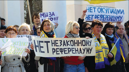 Напередодн╕ референдуму, як ╕ щодня п╕сля 9 березня, б╕ля пам’ятника Тарасов╕ Шевченку збираються люди, вимагаючи свободи для укра╖нських актив╕ст╕в. Те, що викор╕нити ╕дею не так просто, як ╕золювати в╕д сусп╕льства людину, показав ╕ нин╕шн╕й м╕тинг. На зм╕ну Серг╕ю Ковальському та Андр╕ю Щекуну прийшли ╕нш╕, молод╕ рос╕йськомовн╕ хлопц╕, вони п╕дхопили жовто-блакитний прапор, який хтось вже бачив затоптаним у багнюку. Молодь виступала проти референдуму ╕ за збереження ц╕л╕сност╕ Укра╖ни. Вона говорила про те, що укра╖нський Крим – це ╖хня Батьк╕вщина, ╕ тут н╕хто н╕кого не ображав за мовною чи нац╕ональною ознаками.
