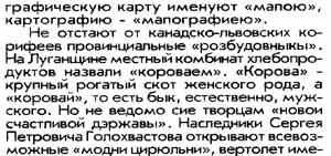 НЕДОУЧИЛИ... Нещодавно в "Крымской правде" (за 24 вересня) опубліковано черговий антиукраїнський опус "Наследники Голохвастова". Один із сучасних "наследников" розпочав свою замітку традиційно. Зливою злостивих мовних кривлянь та обвинувачень на адресу української мови, називаючи державну мову України "бытовым наречием", в якому відсутня маса "общепринятых понятий". Не стану полемізувати з новоявленим Голохвастовим, який прикривається ніби іменем головного редактора газети "Братья Славяне" Владислава Попова, на політичні теми. Все одно це марна справа, бо все, що там накручено і наплетено в "політичному просторі" та "економічному просторі", поставлено з ніг на голову. Однак одну цитату, якою автор твору, переконаний, увійде в історію, слід навести. Бідний-бідний великий луганчанин Володимир Даль (до речі, в художній літературі виступав під псевдонімом "Казак Луганский"), який не знав, що означає слово "каравай" (чи "коровай"). У другому томі свого безсмертного "Толкового словаря живого великорусского языка" він писав: "Каравай или коровай... каравай хлhба, каравай сыра, сала..." (цитую за московським виданням словника 1989 р., с. 89; див. також с. 168). Не стану цитувати всю статтю про слово "каравай", але підкреслю, що серед майже десяти значень цього слова Володимир Даль не наводить значення "бык". Можливо, що таке значення придумав слову "каравай" якийсь сучасний Голохвастов. Але інтелігентній людині, яка працює зі словом, не варто ні російською, ні українською мовою повторювати таку неоковирну потвору.