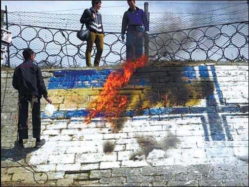 Напередодн╕ Великодн╕х свят пророс╕йськ╕ актив╕сти Севастополя моб╕л╕зували бажаючих на «суботник» ╕з «зачистки» залишк╕в укра╖нсько╖ символ╕ки на територ╕╖ м╕ста, пов╕домля╓ «Укр╕нформ». «Подразниками» виявилися два граф╕т╕ розм╕ром 5 на 8 метр╕в кожне ╕з зображеннями Державного прапора Укра╖ни та прапора В╕йськово-Морських Сил Укра╖ни. Зображення були нанесен╕ фарбою на навск╕сн╕й п╕дп╕рн╕й ст╕н╕ колишньо╖ 4-о╖ берегово╖ батаре╖ ╕сторичного району Севастополя «П╕вн╕чна сторона». Спочатку пророс╕йськ╕ актив╕сти робили спроби обливати граф╕т╕ бензином та випалювати ╖х, пот╕м взялися зр╕зати верхн╕й шар каменя, просоченого фарбою, за допомогою «болгарок»... Як в╕домо, граф╕т╕ синьо-жовтих стяг╕в укра╖нськ╕ актив╕сти нанесли на п╕дп╕рн╕й ст╕нц╕ «П╕вн╕чно╖ сторони» ще у 2009 роц╕ — поруч ╕з зображеннями андр╕╖вського та рос╕йського прапор╕в. Тод╕ м╕ж зображеннями головних символ╕в двох держав укра╖нц╕ дописали слово «Дружба». Нин╕ вс╕ ц╕ «дописи» ретельно зачищаються...