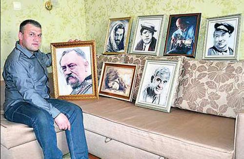 — У рел╕г╕йн╕ свята вишиваю. Якщо комусь можна пити гор╕лку, то х╕ба гр╕х працювати голкою з ниткою? Богов╕ ж н╕чого поганого не роблю. У вих╕дн╕ сиджу над вишиванням по 8 годин, — каже 44-р╕чний Серг╕й Притула, зв’язк╕вець ╕з Черкас. Працю╓ на п╕дпри╓мств╕ «Азот». Вишива╓ портрети в╕домих людей. Ма╓ 180 роб╕т. Зустр╕ча╓мося у його квартир╕. Господар запрошу╓ до св╕тло╖ зали. М╕ж журнальним столиком та кр╕слом сто╖ть 5-л╕трова пластикова пляшка з╕ зр╕заним верхом, наполовину заповнена кольоровими нитками. — Першим зробив портрет актора ╕ режисера Василя Шукшина. Чого т╕льки вартий ф╕льм ╕з ним «Они сражались за Родину». П╕д час зйомок 2 жовтня 1974 року в╕н раптово помер на теплоход╕ «Дунай». Зобразив Шукшина у чорно-б╕лих тонах. В╕н задумливий, ╕з цигаркою в зубах, — виставля╓ на диван╕ к╕лька роб╕т у позолочених рамах. — Пот╕м були рекрут Шевченко, силач ╤ван П╕ддубний. Портрет останнього подарував музею богатиря в його р╕дному сел╕ Красен╕вка Чорноба╖вського району. Фото Олега Скрипки побачив у газет╕. В╕н сто╖ть б╕ля м╕крофона на сцен╕. Було ц╕каво передати, як перелива╓ться бордова велюрова сорочка Скрипки. Тому вишив ╖╖ не мул╕не, а взяв акрилов╕ нитки р╕зних в╕дт╕нк╕в. Вони дають об’╓м. Майстер ставить соб╕ на кол╕на портрет актора Богдана Ступки у рол╕ Тараса Бульби з однойменного ф╕льму рос╕йського режисера Володимира Бортка. — Почав працювати, коли артист ╕ще був живий. Ступка ма╓ мудрий задумливий погляд. Видно пасмо чуба-оселедця. Щоб вид╕лити його, вишивав у три нитки. Невдовз╕ Богдан Ступка помер, ╕ я майже на п╕вроку в╕дклав роботу. Було важко психолог╕чно. Зак╕нчив тор╕к ул╕тку й виставив у «Одноклассниках». За один день було понад три тисяч╕ перегляд╕в, нав╕ть стор╕нка зависла. Виклав роботу в к╕лькох ╕нтернет-магазинах. Ц╕ну навмисне загилив 16 тисяч гривень, щоб н╕хто не купив. Б╕льше хот╕в почути критику, вона надиха╓. А портрети пол╕тик╕в, мабуть, н╕коли не робитиму — не люблю порожн╕х погляд╕в. Вишивати Серг╕й Притула почав у 20 рок╕в. Навчила родичка — баба Мар╕я ╕з Р╕вненщини. — Дала мен╕ свою лляну н╕чну сорочку, бо не було де купити полотна. Вир╕зала клаптик. ╤ показала, як робити хрестики. Тод╕ вишив салфетку. Спочатку робив рушники, але набрида╓ дв╕ч╕ вишивати один ╕ той же узор. Готову роботу майстер пере щ╕ткою та господарським милом. Вишивку до дошки приклею╓ кле╓м ПВА ╕ розправля╓ рукою. — Не прасую — може видавитися клей, а згодом поруд╕╓. Пот╕м картину можна буде так само прати, вишивка не в╕дстане, — продовжу╓ Серг╕й Васильович. — Одна кл╕╓нтка замовила портрет куми. Т╕й так сподобалося, що попросила вишити с╕мейний портрет доньц╕ в Австрал╕ю. На фото вона з батьками на природ╕. Майже метрова картина була готова за 25 дн╕в. За не╖ заплатили б╕льше 2,5 тисяч гривень. Ж╕нка з Черкас на чолов╕кове 60-р╕ччя схот╕ла його портрет. А пот╕м телефону╓ той чолов╕к: що ж це я, наче сирота, вис╕тиму, вишивайте й дружину. Магазинам сво╖ роботи не пропоную, бо можуть вис╕ти п╕вроку, н╕хто не купить. Викладаю ╖х в ╤нтернет╕. Якось на виставц╕ одна в╕дома майстриня п╕д╕йшла до мене ╕ сказала: це все базарщина. Серг╕й Притула народився в селищ╕ Ком╕нтерн Чорноба╖вського району на Черкащин╕ у родин╕ колгоспник╕в. Баба по батьков╕й л╕н╕