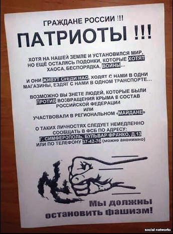 Д╕знавшись, що редактор╕в кримськотатарських газет «Къырым» та «Авдет» запрошували до ФСБ ╕ не знайшовши ╖хн╕х газет у продажу, чи не вперше серйозно замислилася: а чи не почнуть не сьогодн╕ — завтра шукати екстрем╕зм ╕ у мо╖х публ╕кац╕ях? А в╕н не п╕дда╓ться жодному вим╕рюванню: н╕ на вагу, н╕ на зр╕ст, не визнача╓ться ╕ за х╕м╕чним складом, ╕ оц╕нка його наявност╕ завжди суб’╓ктивна. То що ж — можна, а чого — н╕? В╕дпов╕дь спробувала знайти у св╕жих кримських виданнях, у тому числ╕ тих, як╕ завжди вважалися см╕ливими. Газету «Первая Крымская», яка не виходила до цього к╕лька м╕сяц╕в, не вп╕знала взагал╕. Зам╕сть статей, що претендували на об’╓ктивн╕сть ╕ анал╕тику, — суц╕льний «одобрямс» рос╕йськ╕й влад╕, цитати в╕д сучасних «великих» кримських керманич╕в, що красуються на б╕лбордах з п╕дписом «Команда победителей», та ╕нтерв’ю з рос╕йськими чиновниками. Ще й як╕ ╕нтерв’ю! З в╕дпов╕дей секретаря Союзу журнал╕ст╕в РФ Володимира Касют╕на в матер╕ал╕ «Журналистика по-русски: цензура или свобода?» з’ясувати не можна абсолютно н╕чого. Це як у п╕сн╕: «и не то, чтобы да, и не то, чтобы нет». Чи не ╓диними фразами з конкретним смисловим навантаженням я б назвала так╕: «...нужно ни с кем не ссориться»; «Не бывает свободы мгновенной и гигантской. Ты должен каждый день по миллиметру отвоевывать пространство», а ще визнання того, що пропаганди може бути «на каком-то телеканале 80%». Але все це н╕як не вплива╓ на загальну позитивну оц╕нку того, що в╕дбува╓ться в рос╕йському ╕нформац╕йному простор╕. Б╕льш за те, склада╓ться враження, що в Рос╕╖ ╕снують зовс╕м ╕нш╕, не притаманн╕ нам уявлення про моральн╕сть. Буквально днями в передач╕ «Воскресный вечер» ╖╖ ведучий пафосно заявляв, що, на в╕дм╕ну в╕д Америки, Рос╕я ще жодного разу не була сп╕ймана на брехн╕. Можливо, й так, якщо ор╕╓нтуватися на притчу про невловимого Джо, якого н╕хто не ловив. А якщо, окр╕м жарт╕в, то ще к╕лька м╕сяц╕в тому п╕д час захоплення Криму тут рясно красувалися «зелен╕ чолов╕чки» без будь-яких розп╕знавальних знак╕в, котрих цнотлив╕ укра╖нськ╕ ЗМ╤ називали нев╕домими (прямо-таки НЛО!), а президент Пут╕н категорично заперечував ╖хню приналежн╕сть до Рос╕╖. ╤ лише коли вс╕ законодавч╕ документи на Крим було оформлено, на увесь св╕т заявив, що це, звичайно ж, були рос╕йськ╕ солдати. Такий самий вар╕ант прораховувався ╕ на сход╕ Укра╖ни. Телеканали хором стверджують, що ополченц╕ ╕снують сам╕ по соб╕, ╕ що ╖хн╕й зв’язок з Рос╕╓ю ще н╕кому «довести не вдалося». То зв╕дки ж у цих «хл╕бороб╕в» та «шахтар╕в» ст╕льки збро╖, зв╕дки у них пров╕ант, у той час, коли укра╖нськ╕ в╕йськов╕ по п’ять д╕б сидять на одноденному американському пайку ╕ «закусюють травою»? На як╕ кошти ╕снують ╕ воюють (та ще й як ефективно) ц╕ «хл╕бороби», адже нин╕шнього року не орали, не с╕яли ╕ врожаю не збиратимуть? Як все це ╖м вда╓ться, якщо ╕снують ополченц╕ за рахунок того ж бюджету, що ╕ решта укра╖нц╕в, у тому числ╕ й в╕йськов╕, котр╕ не мають нав╕ть взуття ╕ за верс╕╓ю рос╕йських ЗМ╤ йдуть в б╕й у пляжних капцях? Тож ╕ бойовий дух в укра╖нц╕в на нул╕, вони масово здаються «хл╕боробам», кер╕вники яких мають (╕ це не заперечу╓ться) рос╕йське громадянство. Але ополченц╕ не звинувачують себе в тому, що св╕