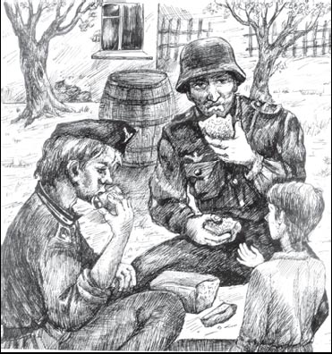 За в╕кном розгулялася зав╕рюха. ╥╖ скаженому танцю акомпанувала труба димаря, а ясен, що р╕с за хатою, стукот╕в г╕лляками по зал╕зн╕й покр╕вл╕, наче вибивав у барабан. Ухкала, завивала зав╕рюха. Аж Юрков╕ ставало страшно... Чого так довго нема╓ мами? Юрко вкрива╓ ноги фуфайкою, шарудить по гол╕й печ╕, але холод, зда╓ться, почина╓ проникати й туди. Якби був тато дома, мама не ходила б у таку зав╕рюху по дрова. В╕д батька н╕ в╕сточки, а в сел╕ хазяйнують н╕мц╕: курка ╕ та бо╖ться носа на св╕т показувати. Юрко лежить на печ╕ ╕ дивиться кр╕зь незамерзлу щ╕лину верхньо╖ шибки кудись далеко у сн╕гову каламуть. Пот╕м бере недогризок ол╕вця, недомальований клапоть с╕рого паперу ╕ продовжу╓ писати татков╕ листа. В╕н зупинився на тому, що дома нема╓ дров. Довго думав, як передати цю фразу. Якби дрова були, то Юрко намалював би купу ╖х на папер╕, а як показати оте «нема»? Юрко в╕дступив нижче ╕ карбував: «Та г╕лляка, що ми з тобою на н╕й щеплювали пеп╕нки, почала всихати, але мама не хоче ╖╖ рубати. Скоро минуть морози. Може, мен╕ полатають чоботи, то я буду помагати мам╕ носити дрова». Ц╕ думки ро╖лися в голов╕ хлопчини, а на папер╕ в╕д ол╕вця залишилися сл╕ди, що нагадували то якусь г╕лляку, то щось под╕бне на чоботи. Т╕ значки ма╓ розшифрувати батько. Писати Юрко не вм╕в, але тато прочита╓. В╕н завжди розум╕в Юрка... «Того садового ножика, що ти мен╕ подарував, — малював дал╕ Юрко, — в мене видер Паньк╕в Грицько. Л╕том я в нього заберу». А як же Юрко пошле листа? В╕н знову задумливо задивився у в╕кно. В’ю-у-у, в’ю-у-у, — свистало за в╕кном. Гур-гур-гур, — бушувало над головою. В’ю-у-у, в’ю-у-у, гур, — чулася Юрков╕ канонада. В╕н бачить в уяв╕, як повзуть п╕д розривами снаряд╕в у зав╕рюху розв╕дники. Один п╕дняв тр╕шки голову, п╕дхопив аркушик паперу, що лет╕в за в╕тром, усм╕хнувся знайомими очима: «Лист в╕д сина», — тихенько проказав ╕ншому. Юрко почав малювати цю картину на папер╕ зам╕сть адреси. Дал╕ в╕н зл╕з з печ╕, просунув ноги у д╕ряв╕ холодн╕ чоботи, стягнув з печ╕ фуфайку, взяв з-п╕д прип╕чка макогона, вдарив ним дв╕ч╕ по ложечц╕ дверно╖ клямки, ╕ набрякл╕ двер╕ в╕дскочили. Зухвала хуртовина шарпнула за поли Юрково╖ фуфайки, обдала його обличчя колючим сн╕гом. Юрко п╕дняв руку з листом, в╕тер п╕дхопив клапоть паперу, ╕ в╕н зник у б╕лому вир╕. Незабаром разом з останньою зав╕рюхою через село ще раз пролет╕ла в╕йна. Н╕мц╕ т╕кали швидко, бо потрапляли в черговий «м╕шок». Ще вчора було чути в╕ддален╕ вибухи гармат, а на завтра в╕д Крутого Яру в село вступили радянськ╕ солдати. Юрко б╕г у важких маминих чоботях ╖м назустр╕ч, ╕ за ним ледве встигав Паньк╕в Грицько… Минали дн╕, надходила з криком журавлиним весна, ж╕нки запрягали кор╕в ╕ прокладали перш╕ борозни. В один з таких дн╕в Юрко сид╕в б╕ля пов╕тки ╕ ладнав возика, зробленого ще батьком. Велика солдатська п╕лотка з червоною з╕ркою насувалась на кругл╕ Юрков╕ оч╕, так╕ ж блакитн╕, як ╕ весняне небо. Хлопець збивав ╖╖ на потилицю ╕ знову прикушував нижню губу, схиляючись над возиком. «Оце поладнаю, — думав Юрко, — ╕ возитиму картоплю на город. Посадимо, он яка виросте, вища мене». Хлопець задоволено шморгав кирпатим носом. В╕н так захопився роботою, що забув нав╕ть стежити за ласт╕вками, як╕ полоскались у мерехтливому пов╕т