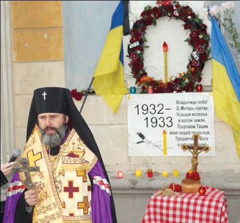 На фото: 2013 р╕к, арх╕╓пископ С╕мферопольський ╕ Кримський Климент (УПЦ КП) проводить молебень б╕ля пам’ятного знаку жертвам Голодомор╕в, який вмонтовано у ст╕ну храму св. Володимира та Ольги у С╕мферопол╕. Цього року тут також чекають небайдужих кримчан на пам’ятн╕ заходи...