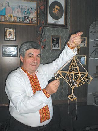 Пригаду╓ться картинка ╕з раннього дитинства, коли я п╕д самою стелею лежав у яворов╕й колисочц╕, а тато колисав мене за ллян╕ вервечки. Мати тим часом сид╕ла б╕ля каганця (електрики ще тод╕ не було) ╕ чаклувала над золотистими соломинками. Я не м╕г збагнути, що з того буде, ╕ т╕льки тод╕, коли мати вже мала в руках готову конструкц╕ю ╕ почепила ╖╖ на сволок, я пильно стежив маленькими оченятами, як воно дивовижно крутиться п╕д стелею, а його наздогнати квапиться чудернацька т╕нь. Це все д╕ялося акурат перед Р╕здвяними святами, а вже коли приходили колядники та гост╕, то вс╕ залюбки милувалися маминим павуком. В╕дтод╕ немало води спливло в космацьких р╕чках, сталося в ╕стор╕╖ мого села Космача хтозна ск╕льки зм╕н, як ╕ в мо╓му житт╕, та цей спомин з мого дитинства й дос╕ не да╓ мен╕ спокою. ╤ надумав я сплести з чар╕вних соломинок такого павука, який запам’ятався з мого дитинства. Почав в╕дтворювати спогади в сво╖й пам’ят╕, зшукувати соломку, нитки, голку, пацьорки та лел╕тки. Найкраще до ц╕╓╖ справи нада╓ться, з мого погляду, солома з жита, хоча можна використовувати ╕ пшеничну та в╕всяну солому. Проте саме житня солома найб╕льш витривала, не колеться. Соломинки треба нар╕зати гострими ножицями розм╕ром с╕м сантиметр╕в. Таких соломинок повинно бути 85. Зрештою, процес виготовлення павука поляга╓ в тому, щоб зробити с╕м сво╓р╕дних цил╕ндр╕в у форм╕ ромба, на кожен з яких витрача╓ться 12 соломинок. Спочатку на нитку нанизу╓ться чотири соломинки ╕ скр╕плю╓ться у форм╕ квадрата, а в╕дтак до кожно╖ л╕н╕╖ квадрата дода╓ться ще по дв╕, як╕ утворюють сво╓р╕дн╕ чотири трикутники. Вершину трикутника треба перекинути через основу в напрямку до центру квадрата. Дал╕ так само посл╕довно перекручують три пари соломин, як╕ залишились на нитц╕. При цьому кожного разу необх╕дно перем╕нювати напрям перекидання: якщо перша пара — до центру, то друга — в╕д центру, третя — до центру, четверта — в╕д центру. Коли перекручено четверту пару, к╕нець нитки зав’язують на вузол, тод╕ утвориться плоска ф╕гура з квадратом у центр╕. Щоб отримати об’╓мну ф╕гуру ромб╕чно╖ форми, треба п╕дняти вгору другий та четвертий трикутники ╕ зв’язати докупи ╖хн╕ вершини; перший та трет╕й трикутники в╕двести в протилежний б╕к ╕ теж зв’язати. Щоб нитка не розколювала соломин, ╖х перед роботою зволожують водою. Таких малих ромб╕в-л╕хтар╕в ма╓ бути 7. Тод╕ почина╓мо робити великий ромб, кожна ╕з 12 соломин якого ма╓ мати 24 сантиметри. Зус╕б╕ч до основного ромба прикр╕плю╓мо маленьк╕ ромби-л╕хтар╕ й утворю╓ться, таким чином, найпрост╕ша конструкц╕я р╕здвяного павука. Тут доречно зробити акцент, що число с╕м ╓ символом святост╕, бо залуча╓ в себе Святу Тр╕йцю (три), Творця св╕ту та «четв╕рку» як знак м╕цност╕ народженого Богом св╕ту. С╕м дн╕в плинуло створення св╕ту ╕ с╕м дн╕в ма╓ тиждень, с╕м та╖нств у Свято╖ церкви ╕ с╕м забарвлень у Небесно╖ веселки, с╕м струн ма╓ л╕ра Орфея та с╕м нот у нотному ряду... С╕м раз╕в м╕ряють ╕ лише один раз в╕др╕зають – гласить укра╖нське народне присл╕в’я. Бо сьомий раз — найточн╕ший. Адже в╕н — святий... С╕м ма╓ ще одну житт╓во важливу християнську символ╕ку: дитя до семи рок╕в — невинна душа. Нав╕ть вважа╓ться, що при н╕й ангели не сидять, а стоять; ╕ при дит