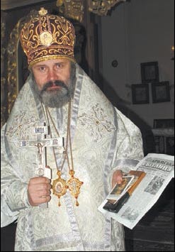 Арх╕╓пископ Климент з першим цьогор╕чним номером «Кримсько╖ св╕тлиц╕», надрукованим на принтер╕. Коли газета прорве ╕нформац╕йну блокаду ╕ зможе надходити до кримських читач╕в у звичному формат╕, зна╓, напевне, лише Бог... (Фото В. Качули)
