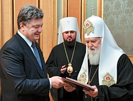 Президент прив╕тав Предстоятеля Укра╖нсько╖ православно╖ церкви Ки╖вського патр╕архату, Патр╕арха Ки╖вського ╕ вс╕╓╖ Руси-Укра╖ни Ф╕ларета з 86-р╕ччям. Глава держави побажав йому м╕цного здоров’я та довгол╕ття. «Дуже пишаюся, що Укра╖на ма╓ людину такого масштабу, яка демонстру╓ дорогу до Бога та дуже високу патр╕отичну позиц╕ю. Випробування, як╕ проходить зараз Укра╖на, продемонстрували, що означа╓ для укра╖нц╕в в╕ра в Бога ╕ наск╕льки важлива Церква», — наголосив Президент. Патр╕арх Ф╕ларет подякував за прив╕тання. «Ми д╕йсно проходимо випробування на те, чи достойн╕ ми мати свою державу, чи н╕. Народ ╕ вся Укра╖на сво╓ю повед╕нкою та д╕ями доводять, що ми достойн╕ мати свою державу», — наголосив в╕н. Патр╕арх Ф╕ларет зазначив, що в╕йна об’╓днала укра╖нц╕в — люди допомагають в╕йськовим та вимушеним переселенцям. «Ми святку╓мо перемогу на Майдан╕, а наступного разу будемо святкувати перемогу в ц╕й в╕йн╕», — впевнений Патр╕арх Ф╕ларет. Глава держави подарував Предстоятелю УПЦ КП ╕кону.