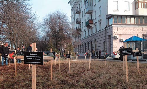 Б╕ля буд╕вл╕ посольства Рос╕йсько╖ Федерац╕╖ у Ки╓в╕ в нед╕лю вдень група актив╕ст╕в встановила пам’ятн╕ хрести з ╕менами загиблих п╕д час обстр╕лу Мар╕уполя 24 с╕чня. Як переда╓ кореспондент агентства «╤нтерфакс-Укра╖на», група актив╕ст╕в прийшла п╕д буд╕влю посольства РФ в Укра╖н╕. Вони вбили в газон навпроти буд╕вл╕ 30 дерев’яних хрест╕в, на яких прикр╕плен╕ таблички з ╕менами загиблих жител╕в Мар╕уполя. На кожн╕й табличц╕ написано: «Убитий рос╕йськими окупантами». Орган╕затор акц╕╖, киянин ╢вген Чеботарьов, наголосив в ╕нтерв’ю журнал╕стам, що ц╕╓ю акц╕╓ю присутн╕ висловили св╕й протест д╕ям РФ на територ╕╖ Укра╖ни. В╕н зазначив, що загибл╕ внасл╕док бойових д╕й на Донбас╕ не повинн╕ залишитися в пам’ят╕ людей т╕льки у вигляд╕ «сухо╖ статистики». ╢. Чеботарьов також вважа╓, що укра╖нська д╕аспора могла б провести под╕бн╕ акц╕╖ б╕ля посольств та консульств РФ у ╕нших кра╖нах, щоб вплинути на громадську думку в цих державах ╕ ставлення до под╕й на Донбас╕. Акц╕я пройшла спок╕йно, правопорядок забезпечувала незначна к╕льк╕сть правоохоронц╕в ╕ правопорушень не було. Територ╕я посольства, кр╕м стац╕онарного паркану, також огороджена розб╕рним металевим парканом, на якому висить табличка «Тривають буд╕вельн╕ роботи». Як пов╕домлялося, 24 с╕чня бойовики з реактивних систем залпового вогню обстр╕ляли житловий масив «Сх╕дний» у Мар╕упол╕. Внасл╕док артилер╕йського удару 31 людина загинула, понад 100 мирних жител╕в д╕стали поранень.
