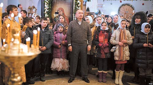 Р╕здво 2015 року. Президент Рос╕╖ В. Пут╕н у храм╕ Покрови Пресвято╖ Богородиц╕ в с. Отрадному п╕д Воронежем. Серед прихожан — д╕ти з притулку, який д╕╓ при цьому храм╕. Прикметно, що там зараз мешка╓ майже п╕всотн╕ б╕женц╕в з укра╖нського Луганська, де виру╓ розпалена найсановн╕шим «богомольцем» братовбивча в╕йна... Ка╖н в╕дпочива╓...