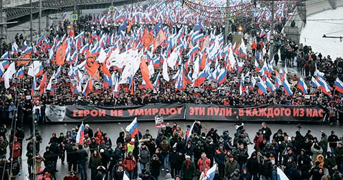 1 березня десятки тисяч людей взяли участь у жалобному марш╕ пам’ят╕ рос╕йського опозиц╕онера Бориса Н╓мцова у Москв╕. Учасники акц╕╖ з╕бралися у центр╕ Москви ╕ пройшли мостом, де був застрелений опозиц╕онер. Людей було так багато, що б╕ля металошукач╕в, через як╕ пропускали учасник╕в маршу, доводилося чекати по 30-40 хвилин. Журнал╕сти назвали цю акц╕ю одн╕╓ю з найчисленн╕ших за останн╕й час. В руках люди несли рос╕йськ╕ прапори, портрети Бориса Н╓мцова, плакати з написами: «Хто наступний?», «БОРИСЬ!», «Н╕ — державн╕й в╕йн╕ ╕ пропаганд╕!», «Слава Н╓мцову, героям слава!» тощо. Були також плакати ╕з закликами зв╕льнити ув’язнену укра╖нку Над╕ю Савченко. До маршруту траурно╖ ходи були стягнут╕ спецзагони пол╕ц╕╖. Акц╕я пройшла загалом орган╕зовано, проте близько 50 ос╕б було затримано «за порушення громадського порядку». Серед них — одягнутий у футболку з портретом Н╓мцова ╕ написом «Геро╖ не вмирають!» народний депутат Укра╖ни Олекс╕й Гончаренко, якого п╕сля к╕лькагодинного утримання у в╕дд╕лку все ж в╕дпустили. За словами О. Гончаренка, його депутатське посв╕дчення назвали «пап╕рцем», у пол╕ц╕╖ його побили. «Я подав заяву про вс╕ неправом╕рн╕ д╕╖ щодо мене, починаючи в╕д побиття сп╕вроб╕тниками пол╕ц╕╖ ╕ зак╕нчуючи недопуском до мене л╕каря та адвоката, — написав на сво╖й стор╕нц╕ у Facebook Олекс╕й Гончаренко. — ╤ суд буде. Над ц╕╓ю системою, яка вбива╓ кращих син╕в ╕ дочок ╕ Укра╖ни, ╕ Рос╕╖»...