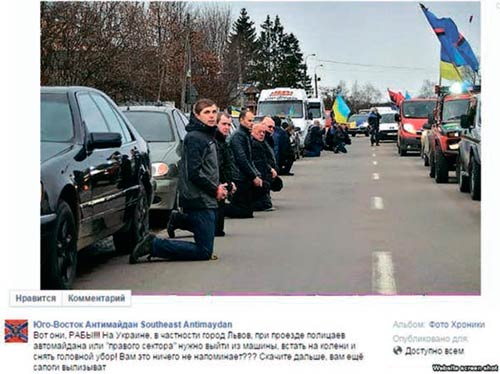 У соц╕альних мережах у групах «Антимайдан» ╕ «Новорос╕я» активно поширюють фото, на якому люди стоять на кол╕нах, а повз них про╖жджають машини з укра╖нськими прапорами, пов╕домля╓ Рад╕о «Свобода». «Ось вони, раби! В Укра╖н╕, зокрема у Львов╕, коли поряд про╖жджають «пол╕ца╖ Автомайдану» або ж «Правий сектор», потр╕бно вийти з машини, встати на кол╕на ╕ зняти капелюха! Вам це н╕чого не нагаду╓? Скач╕ть ╕ дал╕, вам ще чоботи вилизувати», – розпов╕дають п╕д зображенням автори у соцмережах. Ймов╕рно, саме ╕з соцмереж такий фотофейк п╕дхопили й ╕ноземн╕ мед╕а, публ╕куючи, зокрема, новину про «нову укра╖нську демократ╕ю» ╕з гаслами — «вс╕ на кол╕на». Саме публ╕кац╕я з таким зображенням з’явилась на одному з чеських портал╕в. Фото демонструють у контекст╕ ритуалу, який пор╕внюють ╕з ритуалом терористичних орган╕зац╕й, коли громадяни мусять зн╕мати капелюхи перед кортежем терорист╕в. Пишуть, буц╕мто такий ритуал був «удосконалений бандер╕вцями». «Не дивно, що наш╕ ЗМ╤ не ц╕кавить, як почуваються перес╕чн╕ укра╖нц╕, як╕ живуть у контрольован╕й войовничою хунтою держав╕. ╤ не т╕льки на окупованих територ╕ях колишньо╖ Лугансько╖ та Донецько╖ областей, як╕ дос╕ контролю╓ Ки╖в, а й у центральних ╕ зах╕дних рег╕онах кра╖ни, яка розпада╓ться. Пов╕домлення, як╕ надходять ╕з цих рег╕он╕в, часто схож╕ на т╕, що бачимо у сучасному Мосул╕ п╕д владою «╤сламсько╖ держави», – написано на чеському портал╕, який в╕домий, серед ╕ншого, матер╕алами анти╓вропейського, антиамериканського ╕ пророс╕йського зм╕сту, на кшталт: «США хочуть в╕йни з Рос╕╓ю за будь-яку ц╕ну. Американськ╕ окупац╕йн╕ п╕дрозд╕ли вже в нас ╕ не ховаються!». Зн╕мок, який при цьому публ╕кують, насправд╕ показу╓, як жител╕ м╕ста Коломи╖ засв╕дчують повагу загиблому п╕д час бойових д╕й на сход╕ Укра╖ни земляков╕ Роману Фурику. Люди стоять на кол╕нах перед колоною автомоб╕л╕в, щоб провести в останню путь свого героя. На п╕дтвердження цього ╓ ╕ в╕део укра╖нських мед╕а.