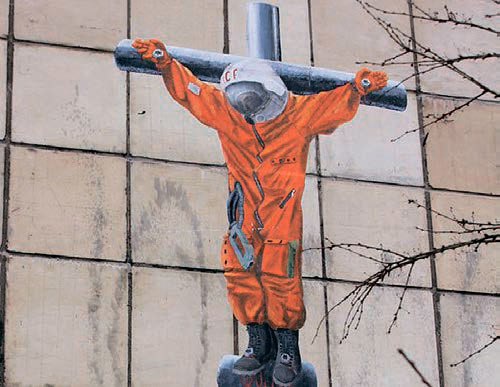 Усе розпочалося ╕з захвату, викликаного зб╕гом Великодня ╕ р╕чниц╕ першого польоту людини в космос. Пермський художник-мурал╕ст Жун╓в у захват╕ написав на фасад╕ будинку ф╕гуру космонавта в оранжевому скафандр╕, з руками, прикрученими болтами до зал╕зного хреста. Одним оком космонавт дивиться на м╕сцеве ракетне училище, другим — на кафедральний собор. Щоб н╕ у кого не виникло сумн╕в╕в, художник назвав проект: «Гагар╕н. Розп’яття». Ну, зобразив, так зобразив. У нас в Ки╓в╕ на фронтонах будинк╕в ще ╕ не так╕ вит╕вки побачиш. Але це у нас. А ось Рос╕я образилася. Спершу якийсь депутат Утк╕н з жахом побачив у граф╕т╕ «ознаки вандал╕зму» ╕ в╕дправив донос «куди надо». З «кудинади» донос потрапив у прокуратуру. А там вир╕шили художника допитати, а артефакт (чимдал╕ в╕д б╕ди) ╕з ст╕ни з╕скребти. Проте виникло морально-ф╕лософське питання. Окремо н╕ в розп’ятт╕, н╕ в Гагар╕н╕ н╕чого негожого н╕бито нема╓. Тому прокурори п╕дстрахувалися — в╕дправили запит до Пермсько╖ ╓парх╕╖ РПЦ. Там вустами священика Володимира Зу╓ва творч╕сть Жун╓ва оц╕нили негативно: «Реагувати мають в╕дпов╕дн╕ органи. Хто зна╓, яка ще ╕дея завтра прийде в голову цьому художников╕, кого ще в╕н роз╕пне у сво╖х роботах…». Конкретного пр╕звища о. Зу╓в не назвав, але кого персонально в╕н мав на уваз╕, ми можемо соб╕ уявити. На допит╕ пермський Ботт╕челл╕ доводив: «Гагар╕н — це сучасний ╤сус в╕д науки, який добров╕льно перейняв на себе перш╕ косм╕чн╕ муки людства. ╤ в╕н став суперз╕ркою…». ╢ретичн╕ висловлювання схвилювали стовп╕в Рос╕йсько╖ православно╖ ╕де╖. Головний ╕деолог РПЦ прото╕╓рей Всеволод Чапл╕н обурився: «Юр╕й Гагар╕н не страждав в╕д того, що полет╕в у космос, а завжди був дуже щасливою людиною». Сам же перформенс назвав «провокац╕╓ю» ╕ св╕дченням «неповаги ╕ до Христа, ╕ до Гагар╕на». От воно як! В╕чний опонент Чапл╕на, теолог, який найб╕льше циту╓ться в Рос╕╖, отець Андр╕й Кура╓в заперечив: «Не думаю, що у художника було бажання когось образити. Хрест — це загальнолюдський символ. Треба бути вдячним художнику за його актуал╕зац╕ю». Рубка титан╕в навколо «розп’ятого Гагар╕на» трива╓ ось вже трет╕й тиждень... Воно ╕ зрозум╕ло: з одного боку, Гагар╕на в Рос╕╖ ус╕ люблять. З ╕ншого, — не наст╕льки ж, щоб зображувати його Христом? П╕дозр╕ле ще одне: а за як╕ так╕ гр╕хи стражда╓ на хрест╕ Юр╕й Олекс╕йович? Чи не мав на уваз╕ художник гр╕хи НКВС, сп╕вроб╕тники якого свого часу в╕дбили леген╕ Серг╕ю Корольову? Вт╕м, прив╕д дала сама РПЦ. Спочатку Кирил п╕дв’язав «подвиг космонавт╕в» до перемоги Господа над злом «косм╕чного масштабу». А пот╕м Чапл╕н роздобув зв╕дкись факти, що Гагар╕н «був не позбавлений рел╕г╕йност╕», ╕ що «мати його була в╕руючою людиною, ╕ в╕домо, що вона п╕д час прийому, присвяченого польоту Гагар╕на, брала благословення у патр╕арха Алекс╕я Першого в присутност╕ усього парт╕йного начальства». Кл╕р ╕ широк╕ маси православних ╕дею п╕дхопили. ╤ ось вже промосковська «Православно-патриотическая газета МИР» так пише про комун╕ста, члена ЦК комсомолу: «Юр╕й Олекс╕йович Гагар╕н був православним християнином... ╤ в план╕ в╕дродження православ’я п╕сля десятил╕ть мракоб╕сся Гагар╕н теж був першопрох╕дцем». А Бога в╕н не побачив у космос╕ т╕льки 