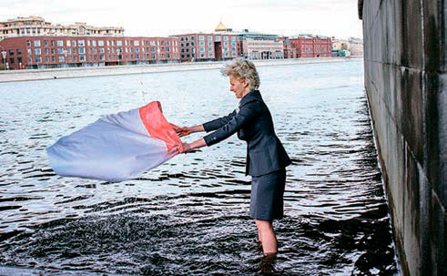 М. Куликовська власноруч виготовила прапор. Акц╕я розпочалася на Московському мосту, дал╕ художниця спустилася на вулицю Кримський вал ╕ пройшла до Москви-р╕ки, в як╕й випрала прапор, змиваючи кольори.