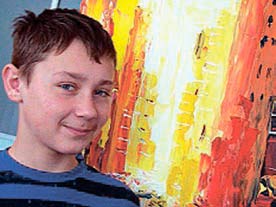 Слухаючи разом з╕ мною Наталю Шачко, Микола Дм╕трух, вчитель Павла, дода╓, що творчий р╕вень його вихованця в╕дпов╕да╓ навичкам значно старших за в╕ком юних художник╕в, нав╕ть ц╕лком сформованих молодих митц╕в. — Колоритн╕, динам╕чн╕ композиц╕╖ просто вражають сво╓ю довершен╕стю ╕ неповторн╕стю. За мою б╕льш як 20-р╕чну роботу у художн╕й школ╕ я вперше працюю з такою талановитою дитиною. З ним працювати дуже легко. В╕н розум╕╓ з п╕вслова. ╤ щораз диву╓ новою роботою, вони аж струменяться, св╕тяться, ви ж сам╕ подив╕ться, — каже пан Микола. А ось ╕ Павло. Заходить у хату, в╕та╓мось. Не за роками серйозний погляд, у спортивному костюм╕, у руках — б╕нокль. — Це що, аби краще розглед╕ти сюжети до майбутн╕х картин? — запитую. — Та н╕, просто дивився через в╕кно у б╕нокль... Терноп╕ль тод╕ ста╓ такий близький. Н╕би рукою подати. Але я люблю одразу перевертати б╕нокль ╕ так знову — ближче-дальше. А що м╕ж цим? Щось таке, що ╓дна╓ те, що далеко, ╕ те, що близько. От би це намалювати... — А ти як взагал╕ пишеш картини, щось ол╕вцем накреслю╓ш, якийсь сюжет накиду╓ш чи одразу на полотн╕ працю╓ш? — Як коли. Часом к╕лька основних л╕н╕й наведу, ╕нод╕, н╕би вже бачу готову картину ╕ тод╕ т╕льки мастих╕ном кладу фарби. Люблю густ╕ мазки, так╕, що н╕би «виходять» з картини — вони так╕, як жив╕. Я не люблю довго малювати, виписувати кожну деталь. Пишу переважно акрилом, швидко сохне, можна шар за шаром наносити. — На тво╖х роботах — м╕ста, будинки, а ще — море, корабл╕, в╕трильники... — Це мен╕ найб╕льше подоба╓ться. М╕сто — теж, як море, де багато людей, а т╕ будинки — то н╕би остр╕вки, пом╕ж яких — п╕шоходи, люди, як риби в океан╕, де корабл╕. Одн╕ стоять в порту, стар╕ вже. ╤нш╕ рухаються, пливуть соб╕. Я це все малюю, н╕би бачу, в╕дчуваю зсередини, що саме так треба, а не ╕накше. Микола Антонович дуже допомага╓, яку фарбу п╕д╕брати, як правильн╕ше нанести мазок, щоб то виглядало краще. Але н╕коли не втруча╓ться, не каже, що я погано намалював, що треба переробити. Я сам бачу, що коли щось не так, ╕ тод╕ дещо вже зм╕нюю. — Разом з╕ сво╖м учителем та батьками ти нещодавно ╖здив на ф╕нал Всеукра╖нського конкурсу «Диво-дитина». — Так, мама, тато, сестричка, бабуся, Микола Антонович дуже переживали за мене. Там так гарно було, урочисто, в╕дом╕ артисти виступали, д╕ти показували, що вони вм╕ють. Картину туди свою велику возив, ╖м сподобалось... ...За мить Павло бере у руки мастих╕н, см╕ливо зачерпу╓ ним в’язку фарбу ╕з чималенького в╕дерця, ╕, як маленькою кельнею, робить блискавичн╕ рухи, й на поверхн╕ картини залишаються кольоров╕ сл╕ди. А пот╕м в╕дклада╓ уб╕к мастих╕н, торка╓ться св╕жо╖ фарби пальцем — рух, ще один — ╕ на полотн╕ народжу╓ться барвисте диво. Тихенько виходимо у сус╕дню к╕мнату, аби не заважати цьому першопочатку майбутньо╖ Павлово╖ картини. — Ми вже нав╕ть сам╕ диву╓мось, чи не втомлю╓ться син, чи не заважко йому все це, — тихо говорить пан Петро, батько Павлика. — В╕н у нас ще й затятий футбол╕ст, м’яч для нього — то теж велике захоплення, вивча╓ н╕мецьку, англ╕йську. Якось встига╓. Нехай розвива╓ться гармон╕йно. Бо так ц╕кав╕ше жити. Кожна людина щось ма╓ творити, залишити п╕сля себе на цьому св╕т╕. Тому й допомага╓мо ╕ Павлу, ╕ Наст╕, нехай д╕тки розвивають сво╖ задатки. Ось п