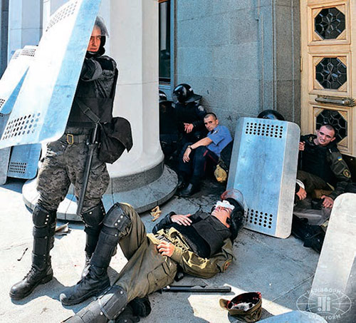 — Там вони народ б’ють, дим ╕де! — п╕дскаку╓ до л╕дера Оксана Корчинська, ╕ вс╕ радикали в супровод╕ журнал╕ст╕в кидаються до виходу з парламенту. Проте центральний заблокований охороною парламенту, боковий теж. — Ход╕мо через п╕дземний х╕д! — кличе Ляшко. Тим часом мирний м╕тинг п╕д Радою вже перестав бути мирним, а звук потужного вибуху засв╕дчив, що под╕╖ розгортаються досить серйозн╕. З в╕кна на другому поверс╕ парламентсько╖ буд╕вл╕ бачу калюжу кров╕ на тротуар╕, чую в╕д колег про десятки поранених правоохоронц╕в. — Хлопцям серйозно порвало ноги! — долина╓ до мене уривок розмови. Це вже пот╕м дов╕дуюсь, що з натовпу в силовик╕в жбурнули бойову гранату. До Ради одна за одною п╕д’╖жджають карети «швидко╖» ╕ машини патрульно╖ служби, в них заносять ╕ заводять поранених правоохоронц╕в. ╥хня к╕льк╕сть св╕дчить, що постраждалих значно б╕льше десятка. — Я бачив, як одного правоохоронця заносили в машину — молодого, такого як я, в╕н такий б╕лий був, навряд чи виживе, — каже один з журнал╕ст╕в. Разом з колегою пробираюсь п╕дземеллями парламенту на Садову, а зв╕дти виходжу на Грушевського. Одночасно з╕ мною туди прибува╓ машина крим╕нал╕стично╖ експертизи. — Хто кинув вибух╕вку, покаже розсл╕дування, тому що це може бути як провокац╕я держорган╕в, як╕ дали команду бити протестувальник╕в, так ╕ провокац╕я якихось людей, — чую коментар об╕знано╖ в тем╕ дружини Дмитра Корчинського. — Я не в╕рю, що хлопц╕-м╕тингувальники почали першими, бо вони були поранен╕ в першу чергу. Вони стояли тут ╕ не розум╕ли, як «Опозиц╕йний блок» може одночасно голосувати з двома парт╕ями коал╕ц╕╖, коли три фракц╕╖ проти. Звичайно, для них це зрада так само, як ╕ для нас, ╕ само собою на них зараз почуття справедливост╕ сильно вплива╓. Т╕, хто з╕штовху╓ лобами народ ╕ правоохоронн╕ органи, повинн╕ в╕дпов╕дати! Щоб спробувати з’ясувати, з чого все почалося, п╕дходжу до нацгвард╕йц╕в, як╕ стоять у першому ряду в╕ч-на- в╕ч з м╕тингувальниками. На цей час «ляшк╕вц╕» вже завершили св╕й м╕тинг ╕ роз╕йшлися, роб╕тники прокатно╖ компан╕╖ розбирають ╖хню трибуну, а з╕ сцени «Свободи» ще лунають промови. Т╕ ╖хн╕ прихильники, переважно ╕стерично╖ повед╕нки ж╕нки старшого в╕ку, яким набридли парт╕йн╕ промови, переключають свою агресивну увагу на правоохоронц╕в ╕ вигукують образи на ╖хню адресу. — Нам нев╕домо, що тут в╕дбулося, — майже пошепки, в╕дводячи погляд, каже у в╕дпов╕дь на мо╓ запитання молодий хлопчина-нацгвард╕╓ць. Придивляюсь до тих, хто сто╖ть поруч з ним. По юних обличчях тече п╕т, зацькован╕ оч╕ видають те, що ко╖ться у ╖хн╕х душах. Н╕би у в╕дгук на мо╖ тод╕шн╕ в╕дчуття пот╕м прочитаю у Facebook в╕домого волонтера Юр╕я Касьянова: «Воювати з нашими ж д╕тьми п╕д смердючою Радою?! Пацани, як╕ захищають нас на сход╕, сьогодн╕ стоять п╕д Радою тому, що виконують наказ! За що ╖х вбивати! Щоб побити шибки у Рад╕, з яко╖ депутати-зрадники вже давно втекли?.. М╕й молодший син був призваний на строкову службу. Не ухилявся. Попав служити у Нацгвард╕ю. У таких же хлопц╕в, як в╕н, що не закосили в╕д служби, сьогодн╕ кинули бойову гранату».