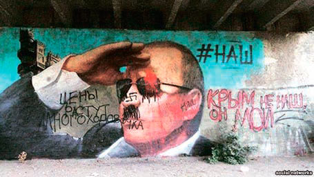 Гумор по-кримськоукра╖нськи В Ялт╕ численн╕ граф╕т╕ ╕з зображенням Володимира Пут╕на, як╕ масово стали з’являтися на ст╕нах будинк╕в, п╕ддалися «доопрацюванню» нев╕домими. М╕ськ╕ комунальн╕ служби посп╕шно зафарбовують з╕псован╕ портрети, пов╕домля╓ кореспондент «Крим.Реал╕╖». 11 вересня на портрет╕ Пут╕на п╕д мостом на в’╖зд╕ в Ялту з’явились написи: «Ц╕ни ростуть, многоходовочка» ╕ «Крим не наш, а м╕й». На додачу Пут╕ну домалювали вуса, схож╕ на вуса Адольфа Г╕тлера, ╕ свастику на нос╕. Под╕бно╖ редакц╕╖ п╕ддався портрет президента Рос╕╖ на перехрест╕ вулиць Ки╖вська та Кривошти в Ялт╕. Навпроти зафарбованого граф╕т╕ п╕д мостом б╕ля автовокзалу красу╓ться не менш «гострий» тег: «Рос╕я котиться в...», де використано нецензурне слово, до якого руки комунальник╕в поки не д╕йшли. М╕ське кер╕вництво Ялти оперативно в╕дреагувало на те, що трапилось, ╕ вже з 10-╖ ранку прац╕вники комунального п╕дпри╓мства зафарбовували портрети Пут╕на с╕рою фарбою. Голова адм╕н╕страц╕╖ Ялти Андр╕й Ростенко ран╕ше заперечував свою причетн╕сть до узгодження м╕сць для виконання «патр╕отичних» граф╕т╕, кажучи, що йому про це н╕чого не в╕домо. При цьому в╕н зазначав, що для под╕бних картин важливо вибирати правильне м╕сце...