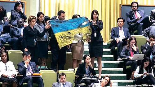 Рос╕йська делегац╕я залишила зал Генерально╖ Асамбле╖ ООН п╕д час виступу Президента Укра╖ни Петра Порошенка на сам╕т╕ з╕ сталого розвитку. Нагада╓мо, 28 вересня у Нью-Йорку на 70-й сес╕╖ Генерально╖ Асамбле╖ ООН стартували щор╕чн╕ загальн╕ дебати, як╕ триватимуть до 3 жовтня. «Ми покинули зал на знак протесту проти в╕дверто пол╕тизовано╖ та агресивно╖ промови, яка абсолютно не в╕дпов╕дала заявлен╕й тем╕ сам╕ту», — розпов╕в ТАСС високопоставлений рос╕йський дипломат. Вт╕м, один делегат з Рос╕╖ все ж залишився в зал╕. Рос╕йська сторона пояснила, що «ма╓ звичку слухати сво╖х опонент╕в ╕ не залишати ╖хн╕ виступи зовс╕м без уваги». Черговий демарш рос╕йська делегац╕я, яка залишила зал Генасамбле╖ ООН перед виступом Петра Порошенка, могла зробити лише в пан╕ц╕. Таку оц╕нку висловив у коментар╕ укра╖нським ЗМ╤ пост╕йний представник Укра╖ни при ООН Юр╕й Серге╓в, переда╓ власний кореспондент «Укр╕нформу». У цьому зв’язку Ю. Серге╓в п╕дкреслив, що рос╕янам нема чого сказати, «у них нема╓ аргумент╕в». В╕н зауважив, що зараз рос╕йська делегац╕я ма╓ в╕дчувати «все б╕льший сором», особливо п╕сля виступу президента Пут╕на в ООН, з якого в зал╕ багато хто «просто см╕явся». Водночас, як п╕дкреслив Серге╓в, виступ Петра Порошенка к╕лька раз╕в переривався аплодисментами. * * * Т╕╓ю ж монетою в╕дплатили рос╕йськ╕й сторон╕ й укра╖нц╕: «Наша делегац╕я вийшла ╕з зали п╕д час виступу рос╕йського президента Пут╕на, на балкон╕ перед ним був розгорнутий прапор Укра╖ни з ╤ловайська, нехай бачить», – написав у Тв╕ттер╕ пост╕йний представник Укра╖ни при ООН Юр╕й Серге╓в. Це — прапор загиблого п╕д ╤ловайськом укра╖нського во╖на, бойовий укра╖нський прапор, прошитий осколками рос╕йських снаряд╕в. «Це — в╕йськовий злочин, який не ма╓ терм╕ну давност╕ ╕ не передбача╓ виступу президента ц╕╓╖ кра╖ни в ст╕нах тако╖ орган╕зац╕╖, як ООН», — вважають члени укра╖нсько╖ делегац╕╖.