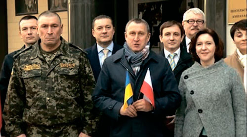JESZCZE POLSKA NIE ZGINELA, KIEDY MY ZYJEMY. CO NAM OBCA PRZEMOC WZIELA, SZABLA ODBIERZEMY! (╤ще Польща не загинула, Коли ми живемо. Що в нас чужа сила взяла, Шаблею в╕дберемо!) Прац╕вники укра╖нського посольства у Польщ╕ на чол╕ з Андр╕╓м Дещицею (на фото) до свята засп╕вали польський г╕мн ╕ розм╕стили ролик в Ютуб╕.