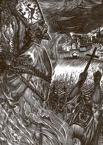 Гус привселюдно розрива╓ буллу, хоч ╕ зна╓, що його чека╓. Папа Римський ╤оанн ХХ╤╤╤ наклав на Гуса ╕нтердикт — тобто заборону на проведення ус╕х церковних д╕й. ╤ тут роз╕гру╓ться п╕дступна ╕нтрига. ╤мператор Римсько╖ ╕мпер╕╖ Сиг╕змунд да╓ Гусу охоронну грамоту, прагнучи показати народу, який в╕н добрий та милосердний. Як кажуть, умив руки. Гус ╖де в Констанцу. ╤ тут його за наказом папи арештовують, вимагають в╕дректися в╕д ╓рес╕. Шевченко пише гн╕вно, з болем: