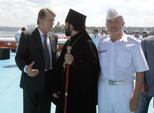 2007 р╕к. Президент Укра╖ни В╕ктор Ющенко, арх╕╓пископ С╕мферопольський ╕ Кримський Климент, перший командувач В╕йськово-Морських Сил Збройних Сил Укра╖ни Борис Кожин у Севастопол╕ (Фото з арх╕ву «Кримсько╖ св╕тлиц╕»)
