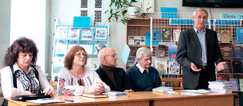 На фото: кримськ╕ письменники Галина Литовченко, Михайло Вишняк, В╕ктор Стус на зустр╕ч╕ з╕ студентами Кримського ╕нженерно-педагог╕чного ун╕верситету до Дня укра╖нсько╖ писемност╕ та мови