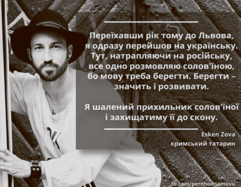 Esken Zova: — Я р╕с у рос╕йськомовному середовищ╕, в С╕мферопол╕. Завжди приваблювала укра╖нська мова сво╓ю мелод╕йн╕стю й гармон╕йн╕стю. ╤нколи сп╕лкувався з друзями, але виходило трохи вимушено через брак розмовно╖ практики. Пере╖хавши р╕к тому до Львова, я одразу перейшов на укра╖нську й рос╕йською сп╕лкуюсь т╕льки з кримськими друзями. Тут, натрапляючи на рос╕йську, все одно розмовляю солов’╖ною, бо мову треба берегти. Берегти — значить ╕ розвивати. Важко усв╕домлювати, що нос╕ям укра╖нсько╖ здеб╕льшого байдуже на красу мови й вони псують ╖╖ запозиченнями — не надто вдалими — з рос╕йсько╖ або польсько╖. Називають це д╕алектом, хоча в╕д справжньо╖ ╜вари мало вже що залишилось, здеб╕льшого це поган╕ кальки з рос╕йсько╖. В Криму я часто боровся за чистоту рос╕йсько╖ мови, виправляючи наголос ╕ см╕ючись ╕з нев╕дшл╕фованих запозичень. Тут, на Галичин╕, мен╕ ╕нколи просто шкода мови. Почувши «Самий кращий», «в╕ддихати», «слишати», хочеться просто замовкнути нав╕к або не сп╕лкуватися з т╕╓ю людиною, але зам╕сть того я купую соб╕ правопис або якусь книжку укра╖нською й продовжую розвиватись. За власн╕ помилки у вимов╕ та орфограф╕╖ мен╕ прикро як першокласнику, ╕ я д╕йсно не розум╕ю людей, як╕ читають т╕льки пости в «П╕дслухано у Львов╕» або ╕нших сп╕льнотах «Вконтакт╕» ╕ зв╕дти надихаються чистотою укра╖нсько╖ мови. Я — шалений прихильник солов’╖но╖ ╕ захищатиму ╖╖ до скону!