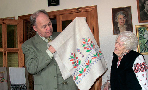 — Ваше ранн╓ дитинство — це окупован╕ фашистами Лубни. Що пам’ята╓те Ви про життя родини в той такий тяжкий для кра╖ни час? — В╕йна почалась, коли мен╕ не було й чотирьох рок╕в, але добре пам’ятаю, як у Лубни прийшли н╕мц╕. Це було восени 1941 року, ми тод╕ жили на вулиц╕ Пушк╕на. Залишилось у пам’ят╕, як уноч╕ ми лежали втрьох — мама, я ╕ бабуся — на л╕жку, затамувавши подих. В╕конниц╕ були закрит╕, але кр╕зь щ╕лини пробивалися смужки св╕тла прожектор╕в ╕ доносилось гр╕зне гуд╕ння ворожих л╕так╕в, котр╕ кружляли над м╕стом або прол╕тали дал╕. Напередодн╕ окупац╕╖ м╕й батько Михайло Стратонович п╕шов добровольцем у винищувальний батальйон, хоч мав броню в╕д моб╕л╕зац╕╖ в арм╕ю. Воював розв╕дником у званн╕ старшини, д╕йшов до само╖ Польщ╕, де був тяжко поранений у 1944 роц╕. Червоноарм╕йц╕ привезли його в Лубни ╕ на носилках внесли в д╕м. Пам’ятаю, що я дуже боявся н╕мецьких жандарм╕в, котр╕ ходили вулицями в обмундируванн╕, завжди парами ╕ при збро╖. Почувши туп╕т чоб╕т, я ховався на город╕ за кущами ╕ з переляку довго там сид╕в. Два роки фашистсько╖ окупац╕╖ були для нашо╖ с╕м’╖, як ╕ для вс╕х лубенц╕в, справжн╕м пеклом. Великою трагед╕╓ю стала контуз╕я, яко╖ мама зазнала в╕д вибуху бомби, скинуто╖ на м╕сто з ворожого л╕така. Тому вона нав╕ть п╕сля л╕кування змушена була част╕ше лежати. Перед зв╕льненням Лубен за нами при╖хав л╕сник, добрий знайомий д╕дуся, ╕ в╕дв╕з нас у сво╓ помешкання в л╕с╕. Там ми були тиждень чи б╕льше, а пот╕м в╕н возом доставив нас додому, пов╕домивши, що в м╕сто зайшла Червона Арм╕я. Коли ми ╖хали, я лежав на с╕н╕ ╕ роздивлявся по обидва боки. В пам’ят╕ виринають так╕ картинки: полум’я у велик╕й буд╕вл╕, як сказала п╕зн╕ше мама, це був виконком м╕сько╖ ради, на вулицях валялись як╕сь н╕мецьк╕ папери, патрони. В╕дступаючи, фашисти розкидали чорн╕ ол╕вц╕ — ╕грашки для д╕тей, коли ╖х в╕дкручували, лунав вибух. Я теж натрапив на такий ол╕вець, але бабуся встигла пом╕тити ╕ в╕д╕брала його в мене. В час окупац╕╖, пригадую, вона ╕нод╕ приносила потроху дуже смачно╖ каш╕. Де вона ╖╖ д╕ставала, я не знав, т╕льки, бувало, брала мамин╕ вишивки й кудись ╕шла, а поверталась з р╕зним настро╓м: то задоволена, коли приносила в сумц╕ продукти, то сумна, й тод╕ казала: «Сьогодн╕ був невдалий день». Пригадую, що пост╕йно в╕дчував голод. Через деякий час п╕сля зв╕льнення Лубен у нас побували мамин╕ брати: спочатку Борис, а пот╕м ╢вген, вони залишили продуктов╕ карточки. Якось двер╕ в╕дчинились, ╕ в б╕лому кожус╕ в к╕мнату зайшов в╕йськовий, я в╕дразу його вп╕знав ╕ кинувся до нього з криком: «Тато при╖хав!». В╕н пробув удома лише три дн╕ й знову по╖хав на фронт. Прив╕з багато продукт╕в, це було свято для вс╕х нас. Оск╕льки мама часто лежала в л╕жку, я запитував: «Тоб╕ боляче?», на що вона в╕дпов╕дала, що все в порядку. Заспокоювала мене, як могла… — Вишивання — це випадковий виб╕р чи поклик душ╕? — Думаю, що цей виб╕р не випадковий. Ще в дитинств╕ мама дала об╕цянку письменнику Володимиру Короленку, що буде добре себе поводити й навчиться гарно вишивати. Як я знаю, спочатку ╖й не хот╕лося сид╕ти над полотном, бо в дитинств╕ була дуже рухливою ╕ невгамовною. Але мала зд╕бност╕ до малювання, що зумовило ц╕кав╕сть ╕ до вишивки. Тож зовс╕м не ви