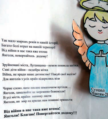 Це уривок ╕з в╕рша 10-р╕чно╖ Пол╕ни Туфекч╕. Вона з мамою мусила пере╖хати ╕з окупованого Луганська в м╕сто Крем╕нна Лугансько╖ област╕. Д╕вчинка розпов╕да╓: «Я сказала мам╕, що в╕д нас в╕длет╕ли вс╕ янголи, тому в Луганськ╕й та Донецьк╕й областях почалася в╕йна. А коли янголи повернуться, знову настане мир. Тому мен╕ захот╕лося повернути янгол╕в у наше м╕сто, з╕бравши ╖х з багатьох куточк╕в св╕ту». Так виникла ╕дея створити Музей янгол╕в чи Музей на крилах, у якому з╕брати ф╕гурки янгол╕в з Укра╖ни та ╕нших кра╖н. Перш╕ експонати подарувала сама Пол╕нка. Вона в╕ддала власну колекц╕ю – близько сорока ф╕гурок янгол╕в. «Крилату» ╕н╕ц╕ативу п╕дхопили переселенц╕ ╕з Луганщини. Нараз╕ для Музею на крилах надана невелика к╕мната у б╕бл╕отец╕ Крем╕нського Свято-Серг╕╖вського чолов╕чого монастиря. Цей монастир обрано не випадково. З травня 2014 року тут проводили молебн╕ д╕тей за мир. Д╕ти молилися щонед╕л╕. Це були д╕ти з р╕зних церков, конфес╕й, нав╕ть дво╓ д╕тей з мусульмансько╖ родини сир╕йських б╕женц╕в. Д╕ти нед╕льно╖ школи монастиря виготовили паперових янгол╕в ╕ г╕рлянди ╕з цукерок, як╕ подарували пораненим б╕йцям, що перебувають у л╕карнях ╕ шпиталях Ки╓ва й Одеси. Для мужньо╖ Над╕╖ Савченко д╕ти п╕дготували подарунок-п╕дтримку – футболку. 21 листопада 2015 року Музей янгол╕в в╕дкрився молитвою, яку п╕днесли до Господа арх╕╓пископ С╓в╓родонецький та Староб╕льський Никодим ╕ брат╕я Свято-Серг╕╖вського монастиря. Серед гостей був ╕ кер╕вник Лугансько╖ обласно╖ в╕йськово-цив╕льно╖ адм╕н╕страц╕╖ Георг╕й Тука. В╕н поповнив «крилату» експозиц╕ю, в як╕й уже було понад п╕втисяч╕ ориг╕нальних експонат╕в, твором народно╖ художниц╕ Луганщини Галини Соловйово╖. Найб╕льше янгол╕в прибуло з Черн╕вецько╖ област╕, проте чимало – з Ки╓ва, В╕нниц╕, Харкова, Полтави, ╓ експонати нав╕ть ╕з США, Б╕лорус╕, ╤тал╕╖ ╕ Япон╕╖. Особливий експонат – паперовий янгол ╕ прив╕тання в╕д сестер Над╕╖ та В╕ри Савченко. Найб╕льше вража╓ ф╕гура обгор╕лого, потемн╕лого в╕д вогню та диму янгола, переданого з Луганська. Мама Пол╕ни, кер╕вник ГО «Громадянський корпус» в Луганськ╕й област╕ Олена Стеценко говорить: «Ми хочемо, щоб цей музей став сво╓р╕дним культурним та духовно-просв╕тницьким центром для наших д╕тей, у якому вони могли б не просто подивитися на колекц╕ю янгол╕в. У майбутн╕х планах – проводити тематичн╕ вечори, спектакл╕, майстер-класи, ц╕кав╕ зустр╕ч╕. Тобто таким чином виховувати духовн╕сть у д╕тей, знайомити ╖х з християнством. А ще ми розм╕стимо в музе╖ карту Укра╖ни, на як╕й будемо позначати м╕ста та села нашо╖ кра╖ни, зв╕дки отриму╓мо янгол╕в у подарунок. Ввважа╓мо, що д╕ти б╕льше д╕знаватимуться про Укра╖ну, ╕ це сприятиме ╖╖ об’╓днанню». ╤дею створення сво╓р╕дного духовно-культурного середовища навколо Музею янгол╕в уже п╕дтримали учасники сп╕льного проекту «Культурний прост╕р – м╕сце для д╕алогу та вза╓морозум╕ння», який реал╕зу╓ться у партнерств╕ Луганського обласного ╕нституту п╕слядипломно╖ педагог╕чно╖ осв╕ти та Полтавсько╖ обласно╖ орган╕зац╕╖ Нац╕онально╖ сп╕лки письменник╕в Укра╖ни за п╕дтримки ╤нституту м╕жнародно╖ сп╕впрац╕ Асоц╕ац╕╖ народних ун╕верситет╕в Н╕меччини та ╓ частиною 