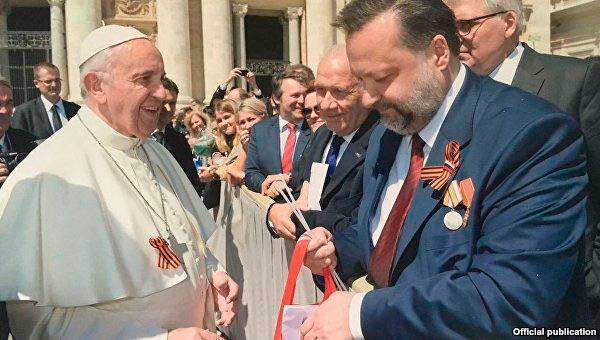 Голова прес-центру Ватикану отець Федер╕ко Ломбард╕ пояснив, що використовувана в Рос╕╖ як символ перемоги у Друг╕й св╕тов╕й в╕йн╕ суперечлива «георг╕╖вська стр╕чка» з’явилася на св╕тлин╕ з папою Римським Франциском через ╖╖ нев╕дом╕сть. Коментар поширив 7 травня сайт Рад╕о Ватикану. «Папа не м╕г знати, що таке «георг╕╖вська стр╕чка», адже за межами колишнього Радянського Союзу вона нев╕дома. Под╕бн╕ реч╕ п╕д час ауд╕╓нц╕й папи трапляються досить часто, ╕ заздалег╕дь передбачити нам╕ри учасник╕в практично неможливо», – вказав кер╕вник прес-центру Ватикану. * * * Поява св╕тлини, на як╕й «георг╕╖вська стр╕чка» прикр╕плена на одяз╕ папи Франциска, викликала обурення багатьох укра╖нських коментатор╕в, оск╕льки в Укра╖н╕ багато людей вважають цю стр╕чку символом окупац╕╖ Рос╕╓ю Криму та частини Донбасу, ╕ ширше символом рос╕йського нео╕мперського реваншизму. ╤стор╕я цього символу ╓ неоднозначною: «георг╕╖вську стр╕чку» використовували ще за час╕в Рос╕йсько╖ ╕мпер╕╖, згодом – б╕логвард╕йц╕, як╕ воювали проти радянсько╖ Рос╕╖. Кавалерами ордену святого Георг╕я з правом носити цю помаранчево-чорну стр╕чку були багато рос╕ян, як╕ воювали на боц╕ нацистсько╖ Н╕меччини, – генерал Петро Краснов, группенфюрер СС Андр╕й Шкуро та ╕нш╕. У радянськ╕й символ╕ц╕ перемоги ця стр╕чка (з незначними зм╕нами й п╕д назвою «гвард╕йська») з’явилася лише в 1945 роц╕ в колодц╕ медал╕ «За Перемогу над Н╕меччиною у Велик╕й В╕тчизнян╕й в╕йн╕». У сучасн╕й Рос╕╖ «георг╕╖вська стр╕чка» як символ, пов’язаний ╕з Днем перемоги, з’явилася т╕льки 2005 року. Влада кра╖ни на певному етап╕ використовувала «георг╕╖вську стр╕чку» на противагу червоному прапору, який асоц╕ю╓ться з комун╕стами. radiosvoboda.org