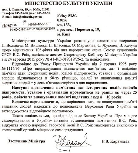 * * * Народну ╕н╕ц╕ативу з в╕дзначення роковин кримсько╖ укра╖нсько╖ Берегин╕, вишивальниц╕-Геро╖н╕ В╕ри Ро╖к М╕нкультури «вшанувало» ось такою в╕дпискою заступника м╕н╕стра. Так само, як ╕ «не пом╕тило» всеукра╖нський л╕тературний конкурс «Ми — д╕ти тво╖, Укра╖но!» ╕мен╕ кримського поета Данила Кононенка, проведений «Кримською св╕тлицею». Ну що б ми з нашою б╕дною культурою (особливо в занедбаному Криму) без нашого найвищого державного культурного в╕домства робили?