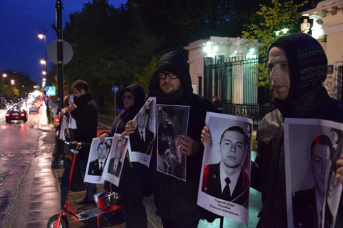 Дек╕лька десятк╕в укра╖нц╕в в чорному одяз╕ минуло╖ п'ятниц╕ увечер╕ розгорнули перед посольством Рос╕╖ у Варшав╕ фотограф╕╖ укра╖нських во╖н╕в, як╕ загинули на сход╕ в результат╕ агрес╕╖ Рос╕╖ на Укра╖ну. Мовчазна акц╕я п╕д назвою "╥х смерть на його сов╕ст╕", яку орган╕зував варшавський ╢вромайдан, була присвячена чергов╕й р╕чниц╕ в╕д дня народження президента Рос╕╖ Володимира Пут╕на, ╕нформу╓ кореспондент «Укр╕нформу». "Ми взяли портрети найближчих нам людей - друз╕в, знайомих, хто в╕ддав життя за Укра╖ну. Для когось - це члени родини, чи той, з ким разом вчилися у школ╕, для когось це просто друз╕, а хтось взяв портрет нев╕домого солдата, з яким н╕коли особисто не був знайомий. ╤ ми п╕д посольством Рос╕╖ мовчимо, але нам зда╓ться, що душ╕ цих людей мають що побажати тому, на чи╖й сов╕ст╕ ╖хня смерть. Тому ми, жив╕, просто трима╓мо сьогодн╕ наших друз╕в за руки ╕ спод╕ва╓мося, що рано чи п╕зно ми переможемо",- заявила в коментар╕ «Укр╕нформу» л╕дер варшавського ╢вромайдану Наталя Панченко. Вона зазначила, що у перший р╕к в╕йни у день народження укра╖нц╕ писали Пут╕ну листи, а тор╕к принесли йому до посольства труни ╕ похоронн╕ в╕нки - те, з чим в╕н прийшов в Укра╖ну. "А цього року ми вир╕шили, що за попередн╕ роки ми сказали все, що хот╕ли сказати. У принцип╕, з т╕╓ю людиною, яка втопила всю Укра╖ну у кров╕, нам б╕льше нема╓ про що говорити",- зазначила Панченко. Акц╕я викликала зац╕кавлення у польських ЗМ╤. ╥╖ учасники розпов╕дали представникам мед╕а про сво╖х близьких ╕ знайомих, яких втратили на сход╕ Укра╖ни.