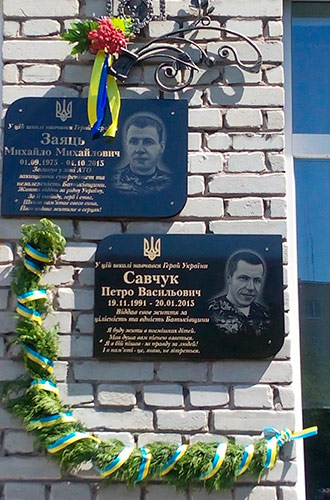 На фото: мемор╕альн╕ дошки, встановлен╕ на фасад╕ ЗОШ №12 м. Червонограда загиблим в АТО колишн╕м учням школи Михайлу Зайцю ╕ Петру Савчуку