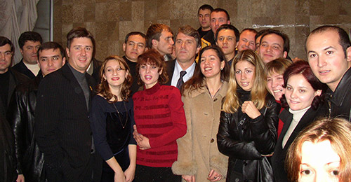 На фото: С╕мферополь, 2003 р╕к, В. Кириленко ╕ майбутн╕й президент В. Ющенко з кримчанами; нин╕шн╕й президент П. Порошенко – ще далеко не в перших лавах (другий л╕воруч) (З арх╕ву «КС»)