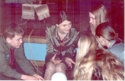 БРЕЙН-РИНГ, який було проведено під гаслом "Шевченко - людина, поет, художник". У ньому взяли участь команди від школи-гімназії № 53, школи-ліцею № 8, школи № 37 та Національної скаутської організації України "Пласт". У напруженій інтелектуальній боротьбі учасники показали свої здібності і зацікавлення у вивченні всього, що повязано з Кобзарем. Найкраще це вдалось команді школи-ліцею № 8, яку підготувала учитель Наталя Миколаївна Радченко. Призи за участь і перемогу у змаганні були надані Гагарінською районною державною адміністрацією м. Севастополя. На фото Зінаїди Беланюк: момент обговорення відповіді командою НСОУ "Пласт".