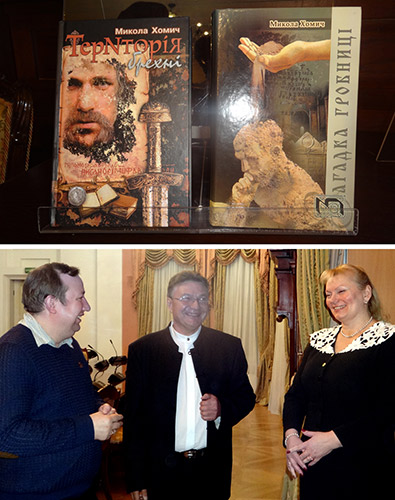 Нещодавно в Ки╓в╕ побачила св╕т дилог╕я сучасного укра╖нського письменника Миколи Хомича – «Територ╕я брехн╕» (видавництво «Юн╕верс») ╕ «Загадка гробниц╕» (видавництво «Самм╕т-книга»). Автор народився в 1959 роц╕ в м╕ст╕ Новоград-Волинському на Житомирщин╕. У В╕нницькому медичному ╕нститут╕ здобув фах л╕каря-пед╕атра. У 1993 роц╕ Микола Хомич залишив державну медицину ╕ започаткував власний б╕знес у сфер╕ страхово╖ та приватно╖ медицини. У 1998 роц╕ пере╖хав у Ки╖в. Микола Хомич любить подорожувати. П╕сля мандр╕вки по Малому Тибету ╕ Г╕малаях почав писати книги. М.Хомич встановив пам’ятник Лес╕ Укра╖нц╕ в сво╓му р╕дному м╕ст╕ Новоград-Волинському та започаткував щор╕чний Всеукра╖нський л╕тературний конкурс для д╕тей «У пошуках л╕тературних талант╕в». Д╕я презентованих роман╕в в╕дбува╓ться в Х╤ стол╕тт╕, п╕д час Друго╖ св╕тово╖ в╕йни ╕ в наш час. Головн╕ геро╖ книг - наш╕ сучасники, як╕ втягуються в розплутування та╓мниць давнини. Вони ╖здять у Скандинав╕ю ╕ США. Автор скористався найнов╕шими досл╕дженнями ки╖вського собору Свято╖ Соф╕╖. На його ст╕нах виявлено стародавн╕ граф╕т╕, як╕ св╕дчать, що храм значно стар╕ший, н╕ж вважалося. Геро╖ книги звертають увагу, що реставроване рос╕йським ученим Герасимовим обличчя князя Ярослава Мудрого ма╓ монголо╖дн╕ риси. Але ж монголи д╕йшли до Рус╕ значно п╕зн╕ше. Микола Хомич пропону╓ свою розгадку ц╕╓╖ та╓мниц╕. У книз╕ «Загадка гробниц╕» Стал╕н да╓ настанову Герасимову, що Ярослав Мудрий ма╓ бути схожим не на шведа, а на рос╕янина, в якого ╓ аз╕йськ╕ предки. У 2009 роц╕ саркофаг Ярослава Мудрого було в╕дкрито, але к╕сток князя там не було. В укра╖нських ем╕грантських газетах пов╕домлялося, що к╕стки Ярослава Мудрого нин╕ в США. Але академ╕к Толочко забороняв оприлюднювати цю ╕нформац╕ю. Генеральний директор Нац╕онального запов╕дника «Соф╕я Ки╖вська», де в╕дбулася презентац╕я дилог╕╖ Хомича, Неля Куковальська говорить, що мощ╕ Ярослава Мудрого вивезли в 1943 роц╕ патр╕оти. Люди боялися, що з поверненням Радянсько╖ влади укра╖нську святиню буде знищено. Чого було спод╕ватися в╕д влади, яка вже знищила Михайл╕вський ╕ Успенський собори та ще багато церков. Зараз вир╕шу╓ться питання про повернення останк╕в князя Ярослава Мудрого в Ки╖в. Неля Куковальська зазнача╓: «Ми - частина ╢вропи. Ми не йдемо в ╢вропу. Ми поверта╓мося в ╢вропу». Микола Хомич вважа╓, що в╕д ╢вропи нас в╕д╕рвало прийняття християнства за в╕зант╕йським зразком. У В╕зант╕╖ церква була п╕дпорядкована держав╕. Звичайно, у Москв╕ додався ще й вплив Золото╖ Орди. Микола Хомич пише: «Лукавство в╕зант╕йщини, нашароване на сх╕дну хитр╕сть коч╕вника, породить нову модель людсько╖ сп╕льноти. Тут завжди будуть говорити одне, робити друге, а думати трет╓. Це проявлятиметься в ус╕ часи, хоч би як називався економ╕чний лад, сусп╕льна формац╕я чи епоха». Письменник зауважу╓ про Московський патр╕архат: «А найсумн╕ше станеться з православ’ям. Його оболонка збережеться, покри╓ться золотом ╕ набуде лоску, але при цьому з нього з╕треться суть християнства, людинолюбство й сп╕вчуття. Заради збереження православ'я священики п╕дуть на все. Будуть виправдовувати злочини влади, ╖╖ найб╕льш ниц╕ вчинки, а починаючи з ХХ стол╕ття ╕ до цього