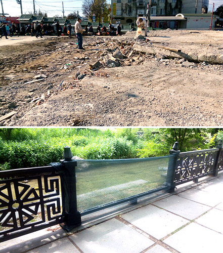 На фото: територ╕я б╕ля с╕мферопольського Центрального ринку сьогодн╕; чиясь «св╕тла» герострат╕вська владна голова додумалася залатати огорожу набережно╖ вздовж Салг╕ра… зеленою буд╕вельною капроновою с╕ткою… а що - «очень даже по-русски»! Фото В. Качули