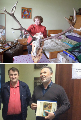 На фото: Лариса Тронько з батьк╕вським мисливським трофе╓м; А. С╓риков (праворуч) з гендиректором Нац╕онального газетно-журнального видавництва А. Щекуном ***