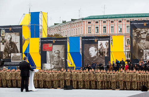 Президент Петро Порошенко з нагоди 75-╖ р╕чниц╕ створення Укра╖нсько╖ повстансько╖ арм╕╖ в╕дзначив боротьбу во╖н╕в УПА проти двох потужних тотал╕тарних режим╕в, кожен з яких прагнув поневолити або винищити укра╖нц╕в. Глава держави процитував фрагмент присяги вояка УПА: «Боротись за повне визволення вс╕х укра╖нських земель ╕ укра╖нського народу в╕д загарбник╕в та здобути Укра╖нську Самост╕йну Соборну Державу. В ц╕й боротьб╕ не пожал╕ю н╕ кров╕, н╕ життя, ╕ буду битись до останнього в╕ддиху ╕ остаточно╖ перемоги над ус╕ма ворогами Укра╖ни». Президент наголосив: «Водночас данина ╕сторичн╕й пам’ят╕ не повинна робити тепер╕шн╓ та майбутн╓ заручником минулого. Ми пам’ята╓мо все величне, не забуваючи ╕ про важк╕ стор╕нки нашо╖ ╕стор╕╖». В╕н нагадав про мудру пораду ╤вана Павла Другого – прощати ╕ просити прощення, тобто в╕дчувати не лише св╕й б╕ль, але й чужий. Глава держави зауважив, що це важливо для того, щоб мати добр╕ стосунки ╕ дов╕ру з ╓вропейськими сус╕дами. «П╕д час Друго╖ св╕тово╖ частина укра╖нц╕в чинила оп╕р одразу двом потужним тотал╕тарним режимам, кожен з яких прагнув поневолити або винищити нас. Для б╕льшост╕ наших д╕д╕в та прад╕д╕в в╕йна зак╕нчилася у травн╕ сорок п’ятого. Але не для вояк╕в УПА. ╥хня боротьба з комун╕стичним тотал╕тарним режимом тривала ще б╕льше десяти рок╕в», - нагадав Петро Порошенко. За його словами, аби здолати во╖н╕в УПА московський режим вдавався до нелюдських метод╕в. Так, 21 жовтня виповниться с╕мдесят рок╕в акц╕╖ «Запад», коли буквально протягом одного дня стал╕нськ╕ карател╕ депортували ╕з зах╕дних областей Укра╖ни до Сиб╕ру понад 76 тис. укра╖нц╕в. «Гарантувати, що н╕коли б╕льше не повторяться под╕бн╕ трагед╕╖, можна лише, коли ми ма╓мо свою м╕цну, сильну, в╕льну ╕ незалежну державу. А для того нам потр╕бна сильна арм╕я, яку ми створили протягом трьох рок╕в ╕ яку пост╕йно зм╕цню╓мо», - зауважив Глава держави, додавши, що сьогодн╕ з Соф╕йсько╖ площ╕ вирушить в одну з в╕йськових частин, щоб передати чергову парт╕ю збро╖ та техн╕ки – дв╕ст╕ одиниць, серед яких 62 танки. Президент висловив слова щиро╖ вдячност╕ ус╕м в╕йськовослужбовцям за геро╖зм ╕ мужн╕сть, самопожертву ╕ звитягу, патр╕отизм ╕ в╕рн╕сть присяз╕. В╕н також подякував ус╕м, хто реальними справами п╕дтриму╓ сьогодн╕ укра╖нське в╕йсько та ветеран╕в АТО. «Княжий дружинник, запорозький козак, c╕човий стр╕лець та во╖н Укра╖нсько╖ народно╖ республ╕ки, вояк УПА та солдат Друго╖ св╕тово╖, б╕йц╕ Збройних Сил та Нац╕онально╖ гвард╕╖, ╕нших силових п╕дрозд╕л╕в – покол╕ння за покол╕нням звитяжно боронили Батьк╕вщину. Зал╕зом, власним потом та кров’ю робили внесок у справу незалежност╕ Укра╖ни. ╤ ми з вами пиша╓мося нашою ╕стор╕╓ю», - п╕дкреслив Петро Порошенко. Глава держави також в╕дзначив стор╕ччя Арм╕╖ Укра╖нсько╖ Народно╖ Республ╕ки, яка боронила укра╖нськ╕ земл╕ в╕д збройно╖ агрес╕╖ з боку червоно╖ ╕ б╕ло╖ Рос╕╖. «Симон Петлюра, ╢вген Коновалець, Петро Болбочан, Марко Безручко, Всеволод Петр╕в, а також тисяч╕ солдат╕в ╕ оф╕цер╕в чинили запеклий оп╕р ворогам. Вони вписали чимало геро╖чних стор╕нок в ╕стор╕ю укра╖нського в╕йська. Саме ╖м присвячена виставка, розм╕щена сьогодн╕ тут, на Соф╕йськ╕й площ╕, ╕ 