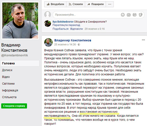 Владимир Константинов 25 жовтня о 14:36 · Вчера Ксения Собчак заявила, что Крым с точки зрения международного права принадлежит Украине. У меня вопрос: это как? Прежде чем ляпать языком, нужно знать, наш Крым или не наш. Политика - очень серьезное дело, особенно когда это касается таких сложных вопросов, которые необходимо изучать. Популизма хватает очень ненадолго, люди это забудут очень быстро. Необходимо знать исторические детали. Для политика это основная работа. Высказывание Собчак - это совершенно ложное мнение, вопиющая непрофессиональность как правовая, так и политическая. Незаконным является государственный переворот на Украине, смещение законных органов власти, разрушение конституции как таковой. Незаконным является преследование крымчан по языковому и культурно-историческому признакам. Выбор крымчан был сделан в период с 20 февраля по 25 мая, в тот период, когда Украина как государство была ликвидирована. В этот период народ Крыма принял для себя историческое решение и восстановил историческую несправедливость. Она об этом ничего не сказала. Когда ляпается такое, то понимаешь, что человек вообще не в курсе того, о чем говорит! https://www.facebook.com/KonstantinovVA/